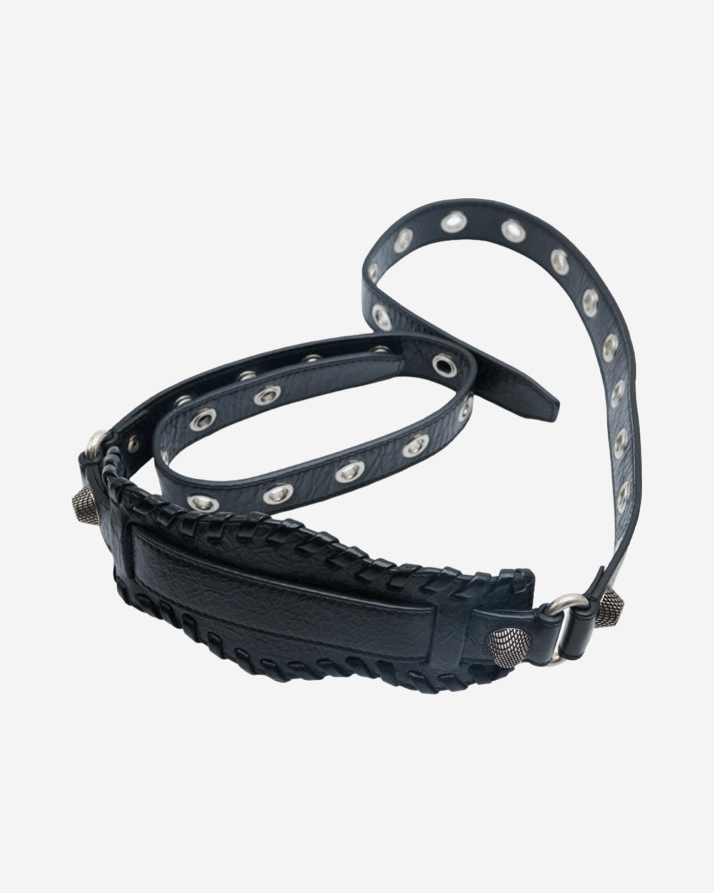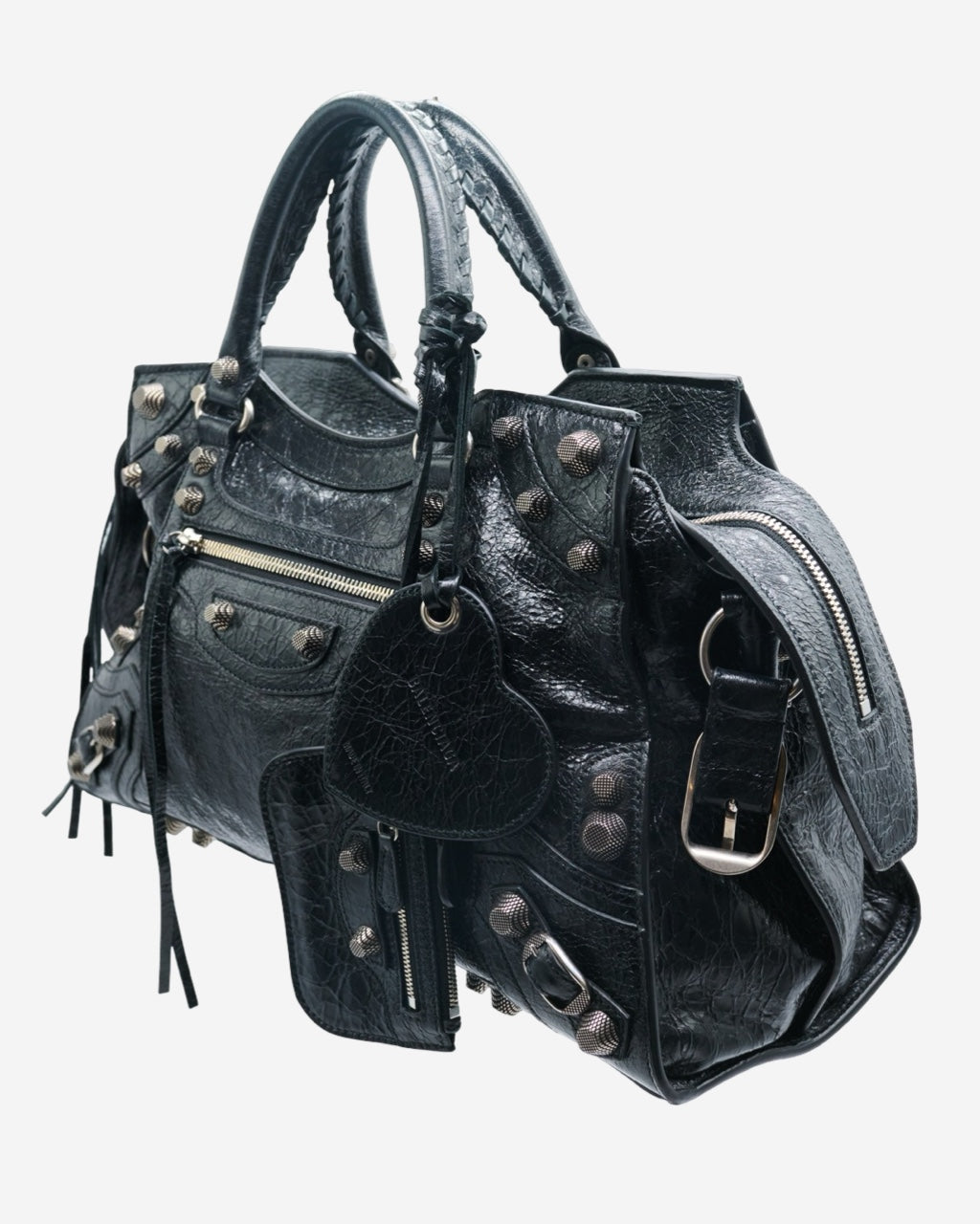 - Description: Balenciaga handbag in black leather, front pocket, double fixed handles, main opening with two-way zipper, black textile lining, silver-tone hardware, card holder and signature heart-shaped mirror
