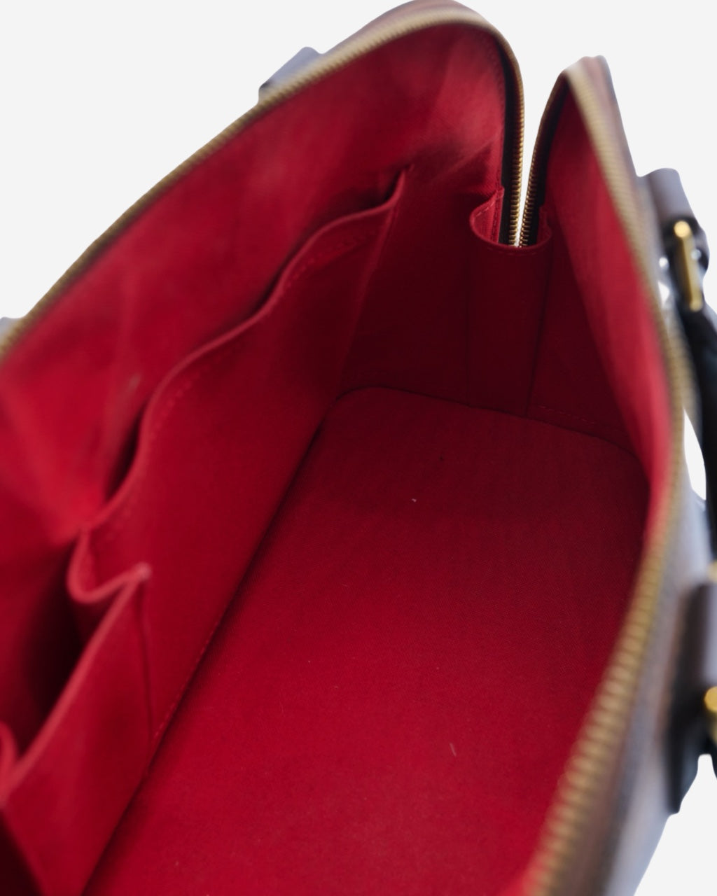 • Description: Louis Vuitton handbag in damier ebene canvas, double fixed handles, main opening with two-way zipper, red textile lining with pockets, gold-tone hardware