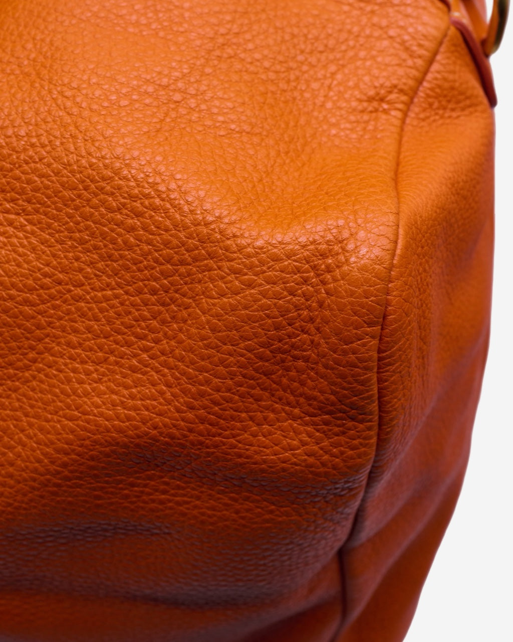 • Description: Prada handbag in orange leather, embossed logo on the front, double fixed handles, removable long handle, main opening with two-way zipper, black textile lining with pockets, gold-tone hardware