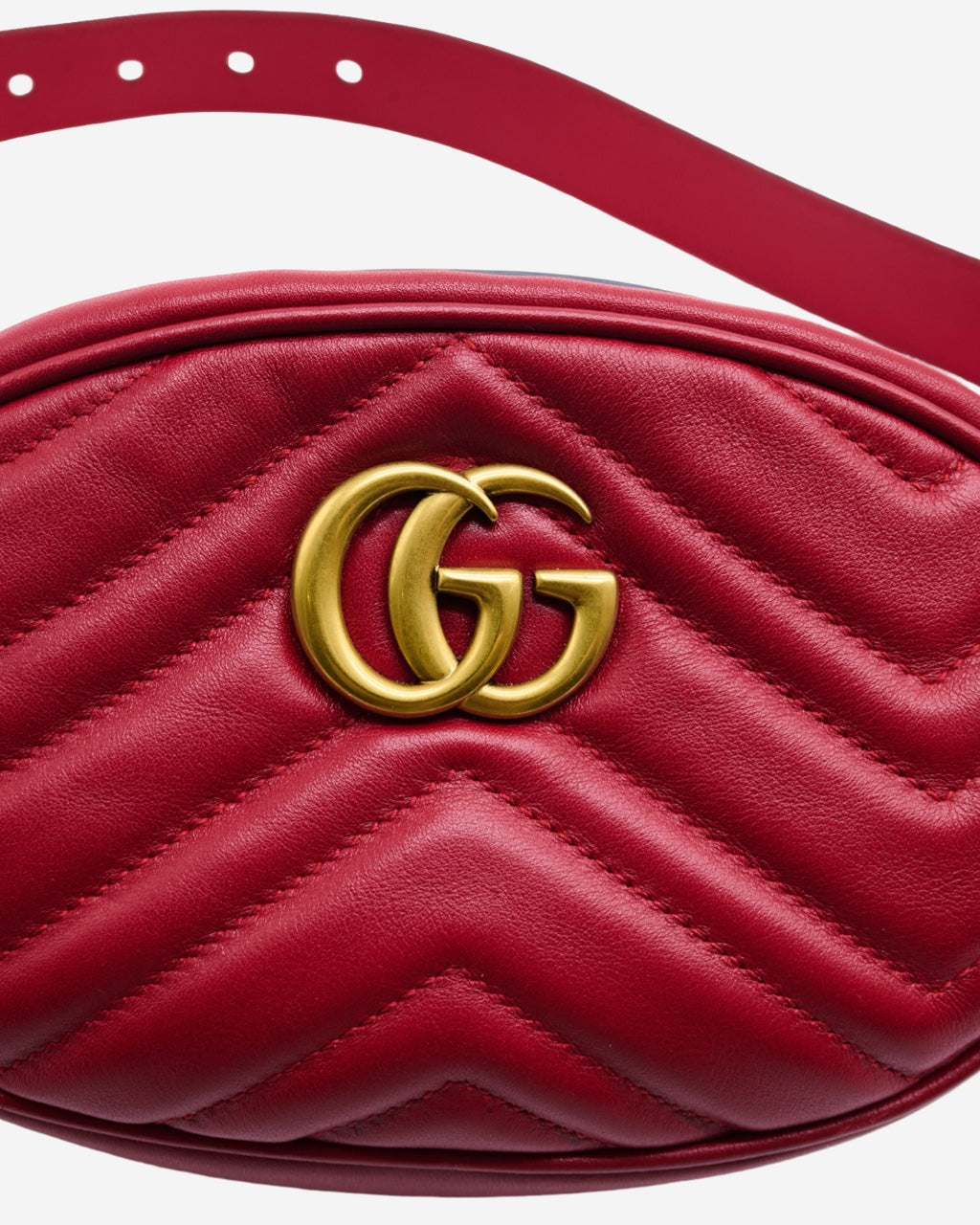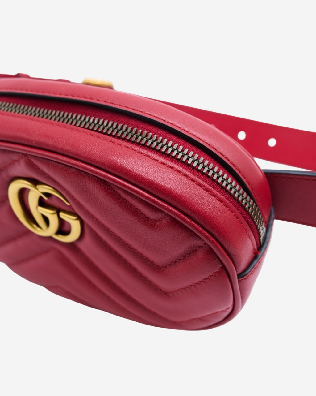 - Description: Gucci fanny pack in red leather, signature GG plaque on the front, main opening with two-way zip, beige suede lining with pocket, belt loop, gold-tone hardware