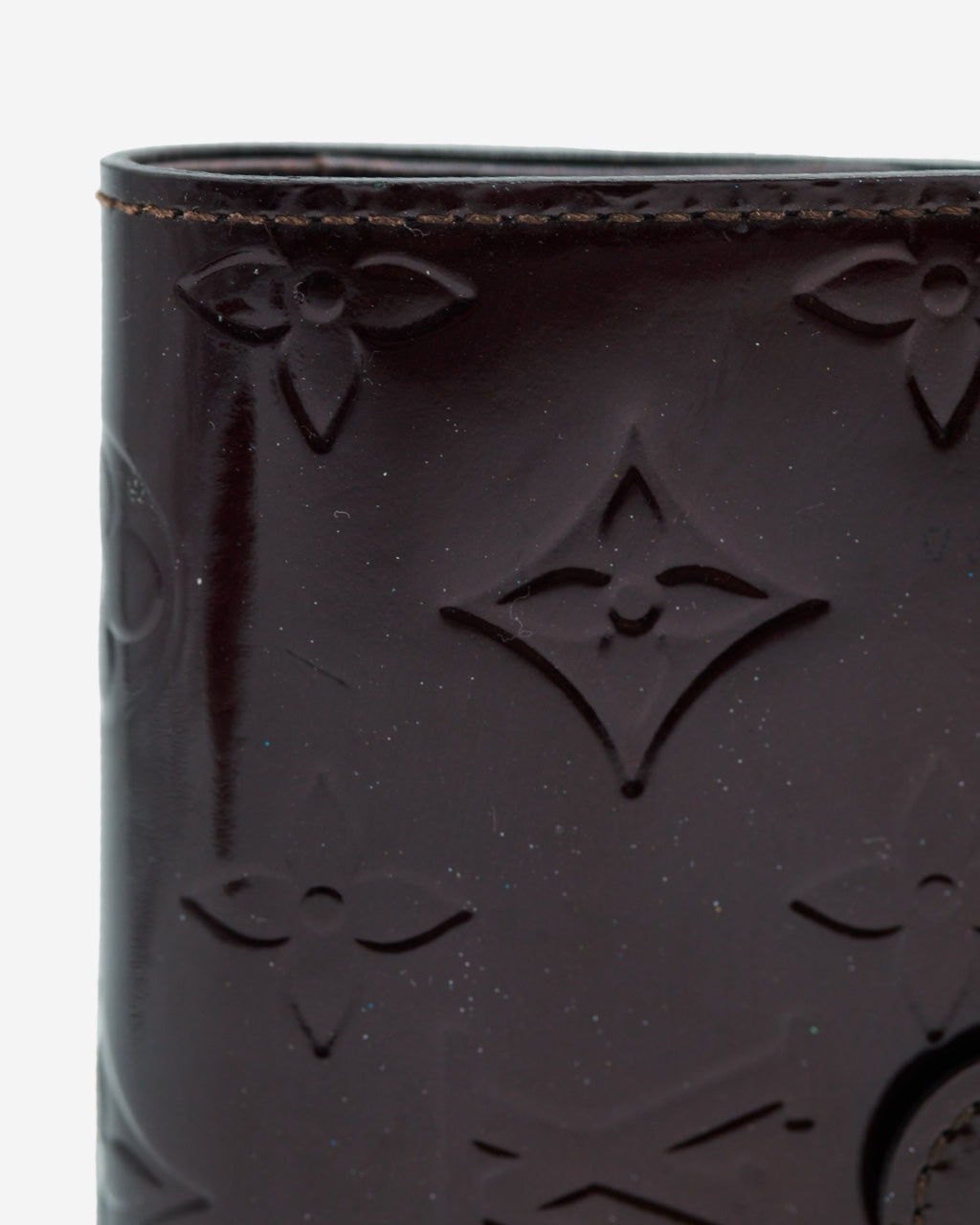 - Description: Louis Vuitton wallet in wine-colored vernis leather, main opening with metal snap closure, coin compartment on the back, leather interior lining, gold-tone hardware