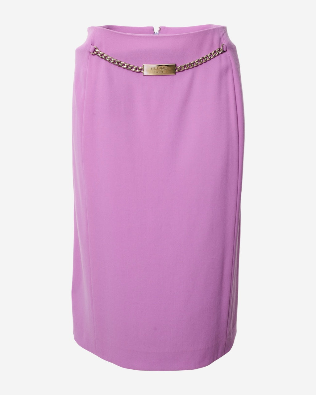 - Description: Celine purple wool skirt, midi length, fitted at the waist with a two-way closure at the back, pencil style, chain motif at the front with engraved logo, silver-tone hardware