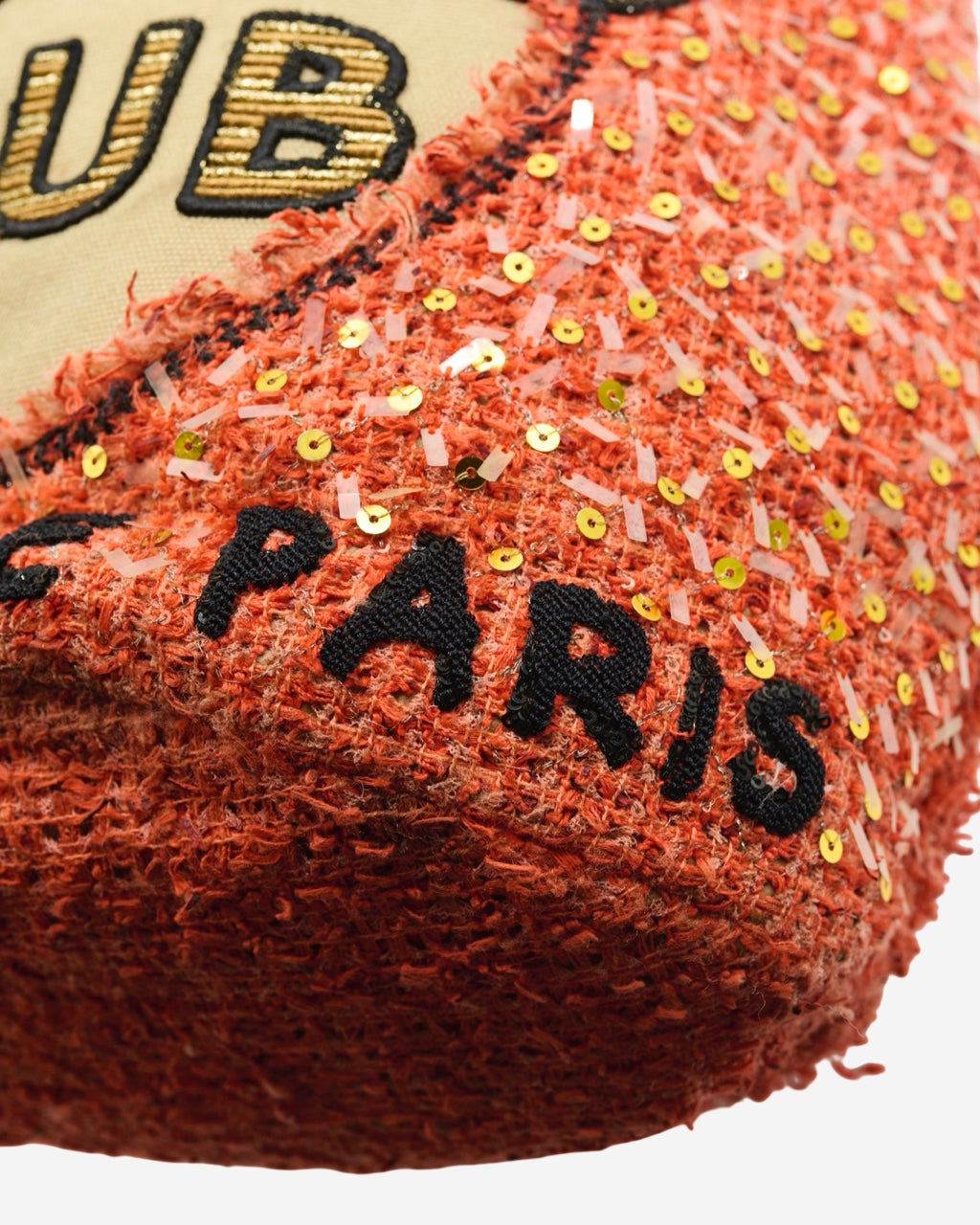 - Description: Chanel orange tweed backpack with beading and embroidery, front 'CC' plaque with matelassé strap, silver-tone hardware, double flat handle with tweed and engraved metal snaps, silver-tone hardware