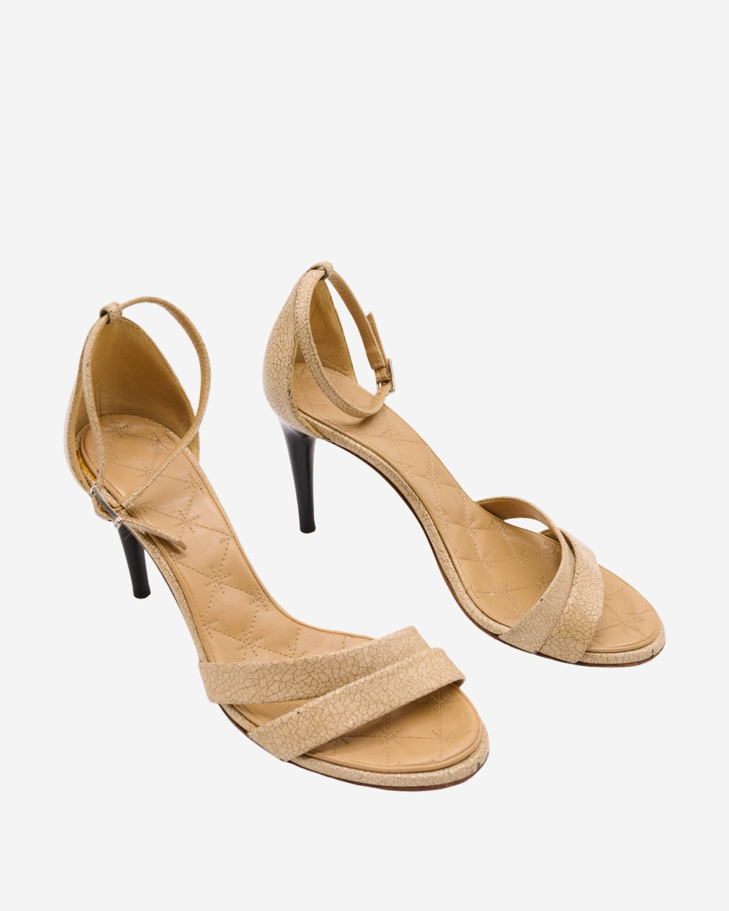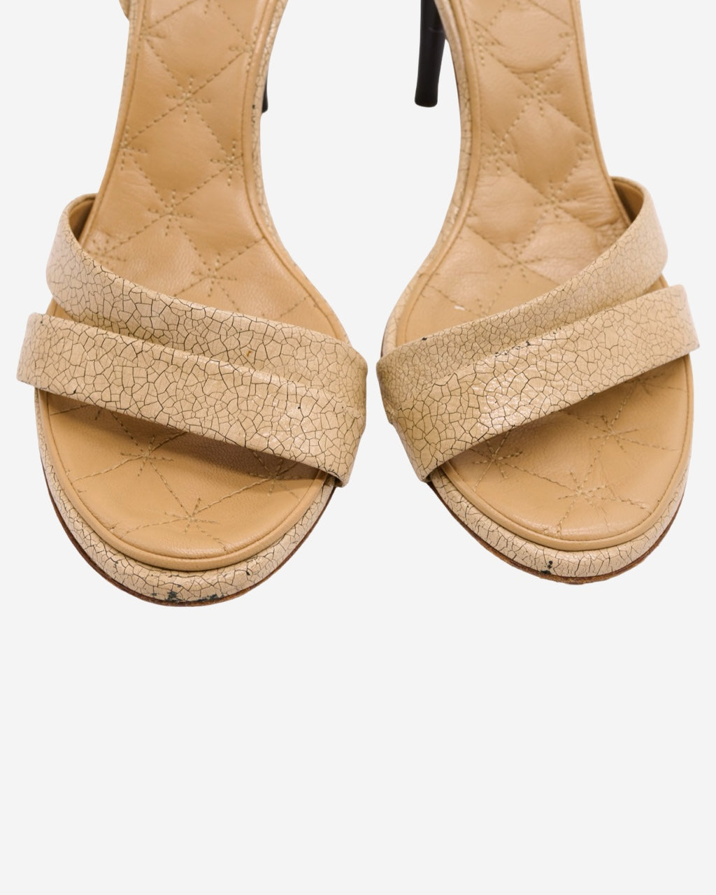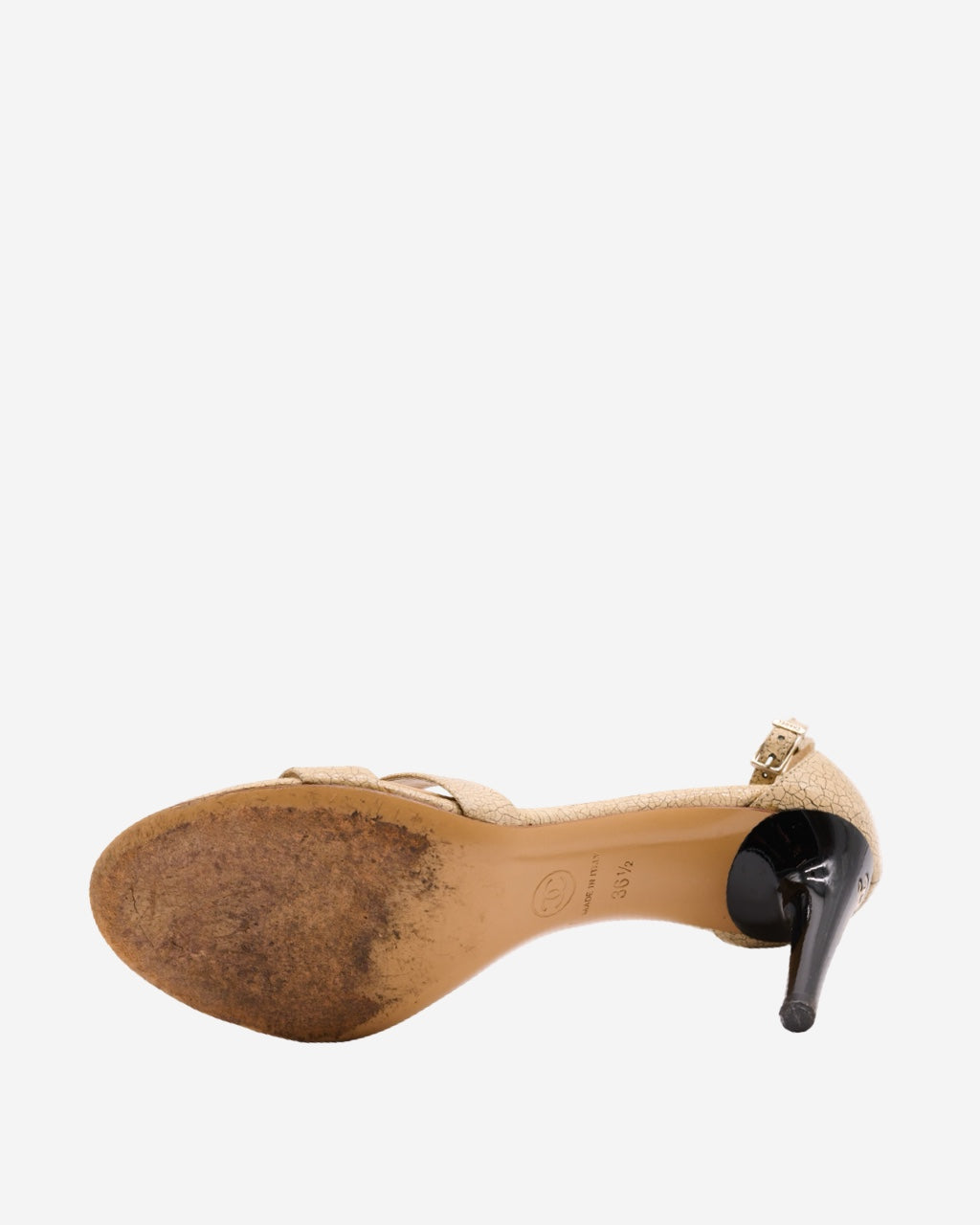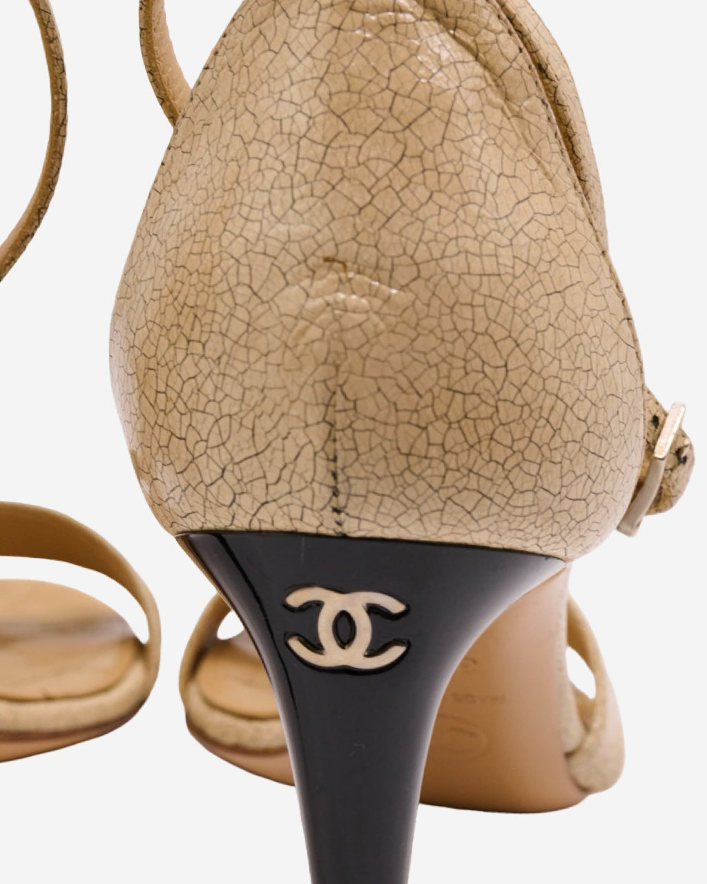 - Description: Chanel heels in beige leather, crackled effect, round toe, ankle strap and metal buckle, thin acrylic heel with signature 'CC' metal plate at the back, silver-tone hardware