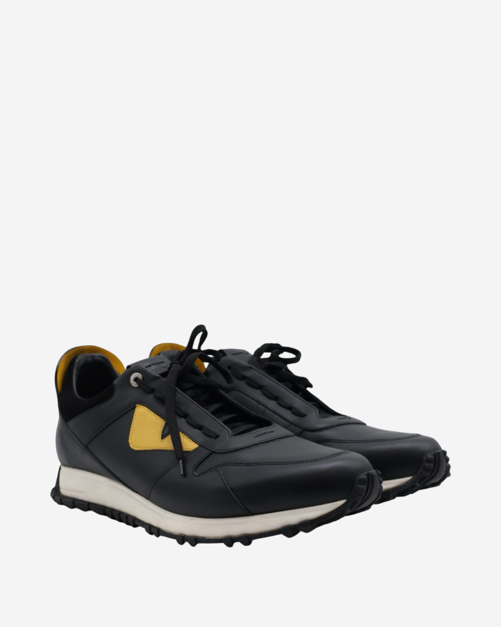 - Description: Black leather sneakers, V-shaped toe, lace-up closure, white rubber sole, monster motif with eyes on the sides and yellow back panel