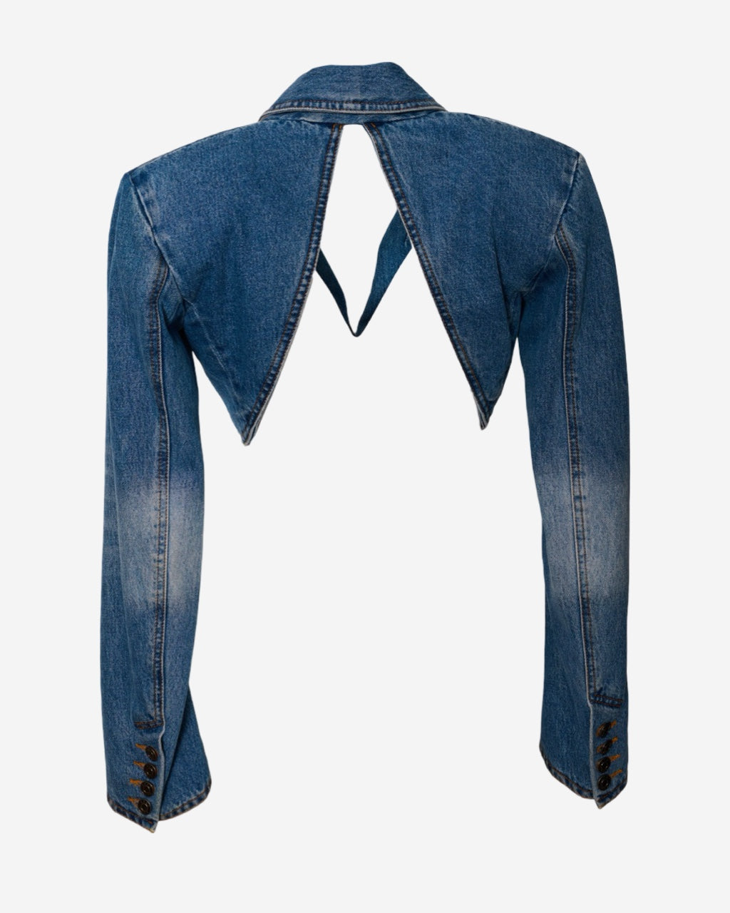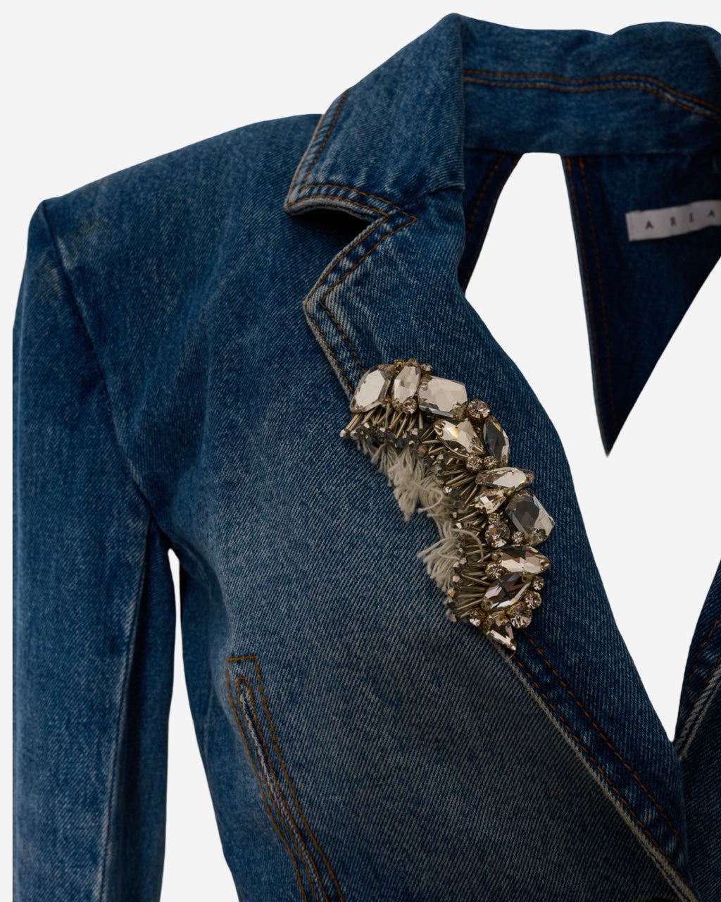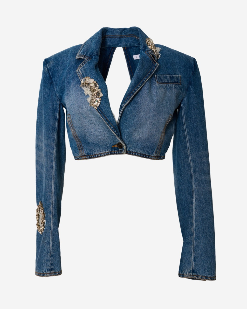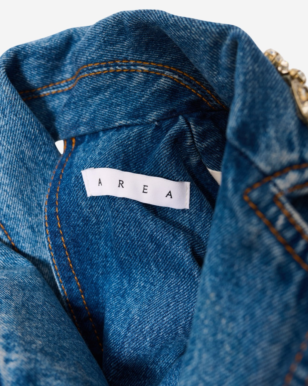 - Description: Denim crossbody bag in blue, peak flap, long sleeves, front button closure, rhinestone distressed detail, silver-tone hardware