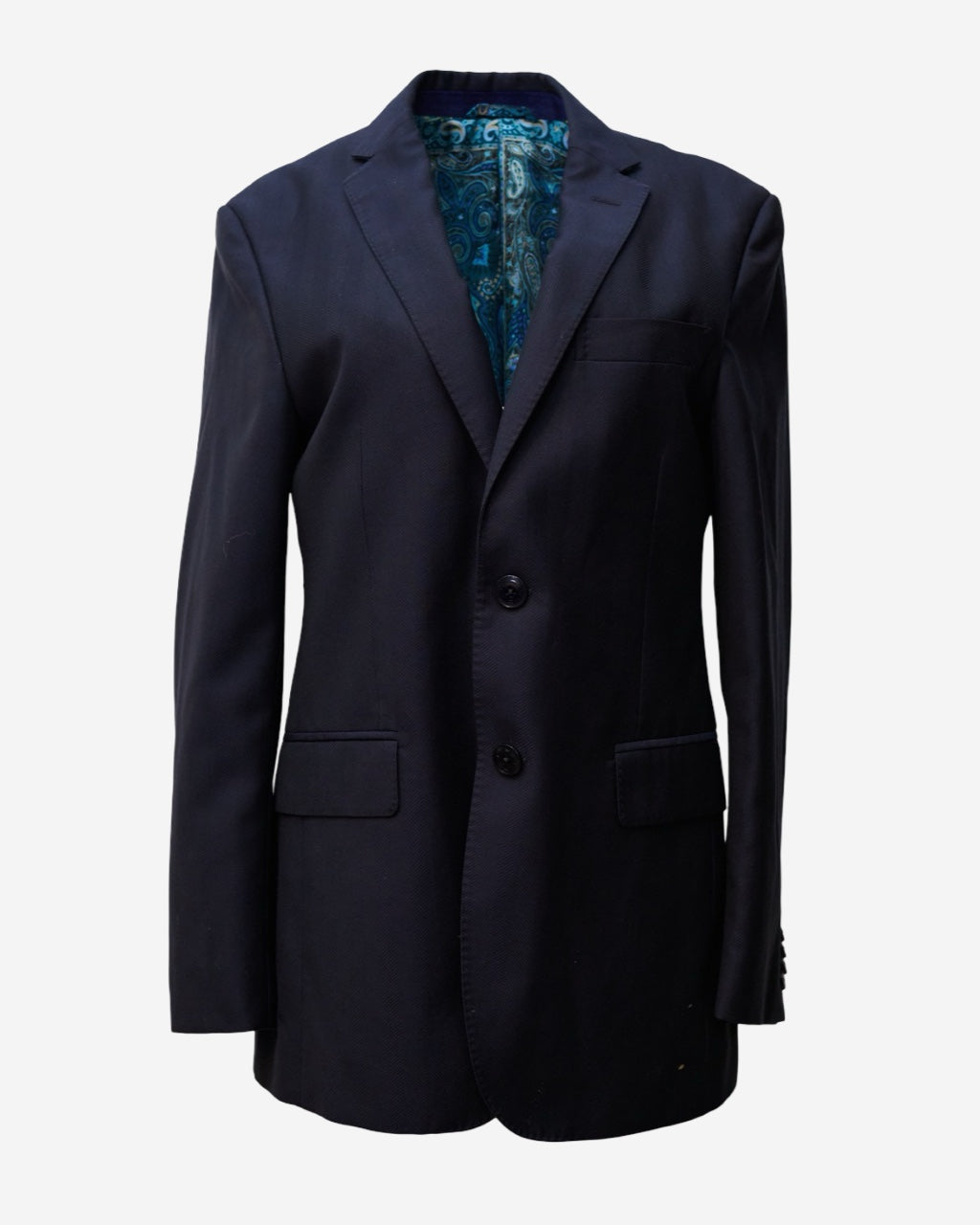 - Description: Blazer Etro in blue, peak lapel, button-front closure, long sleeves, straight cut, satin lining with signature print in shades of blue