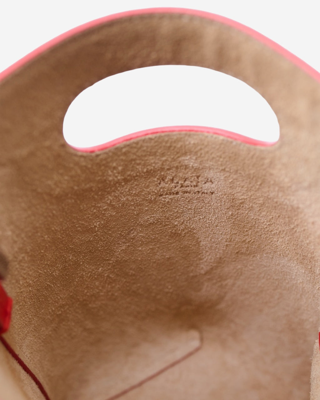 - Description: Alaïa crossbody bag in red leather, two openings in the center, beige suede interior lining with embossing, detachable long leather strap, silver-tone hardware