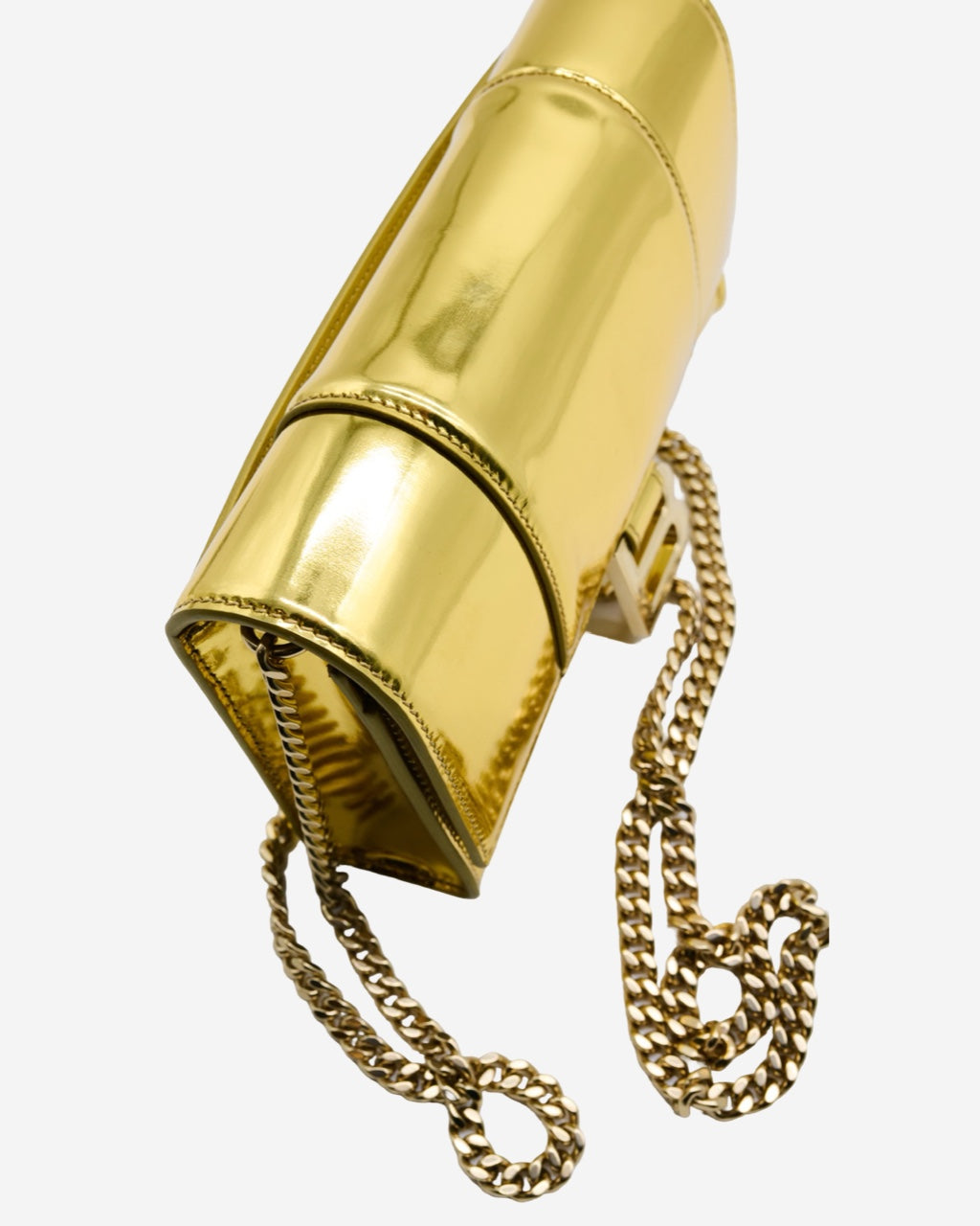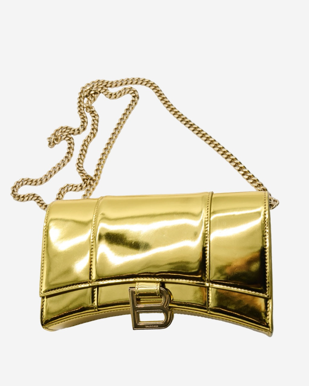 - Description : Balenciaga crossbody bag in gold-tone leather, long chain strap, main opening with flap and magnetic clasp, signature 'B' pendant with engraving, leather interior lining with pocket and double-sided closure, gold-tone hardware