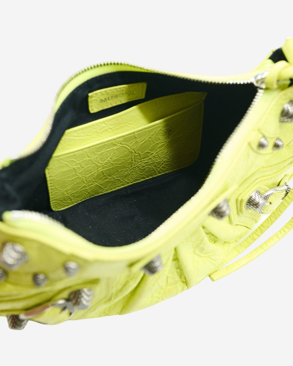 - Description: Balenciaga shoulder bag in yellow leather, signature stud pattern, double top closure, interchangeable long leather and short chain straps, black textile lining with pockets, silver-tone hardware