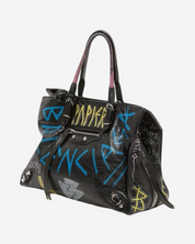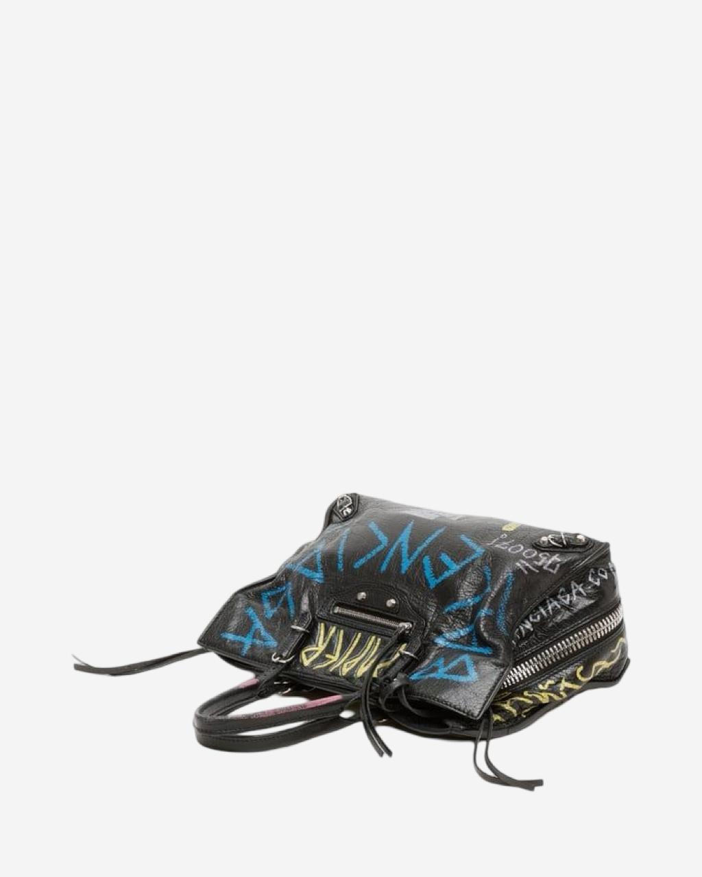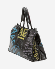 - Description : Black leather tote, double fixed handle, front pocket, silver-tone hardware