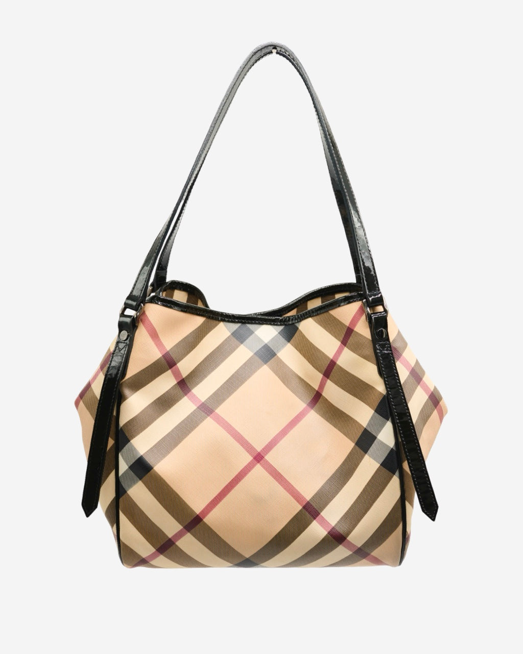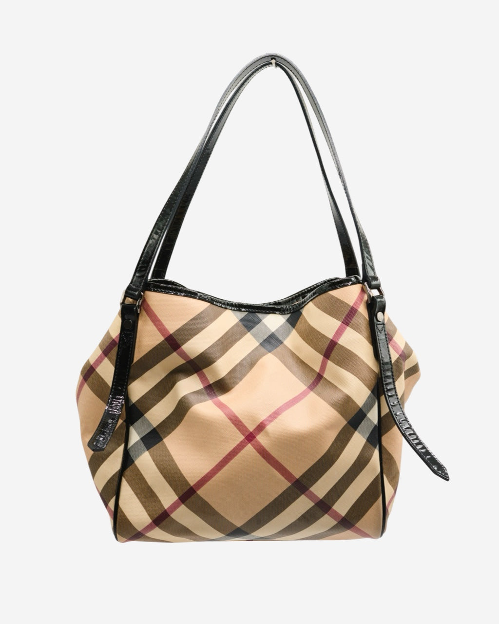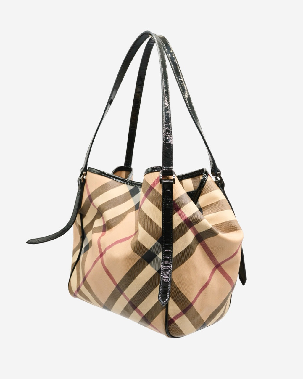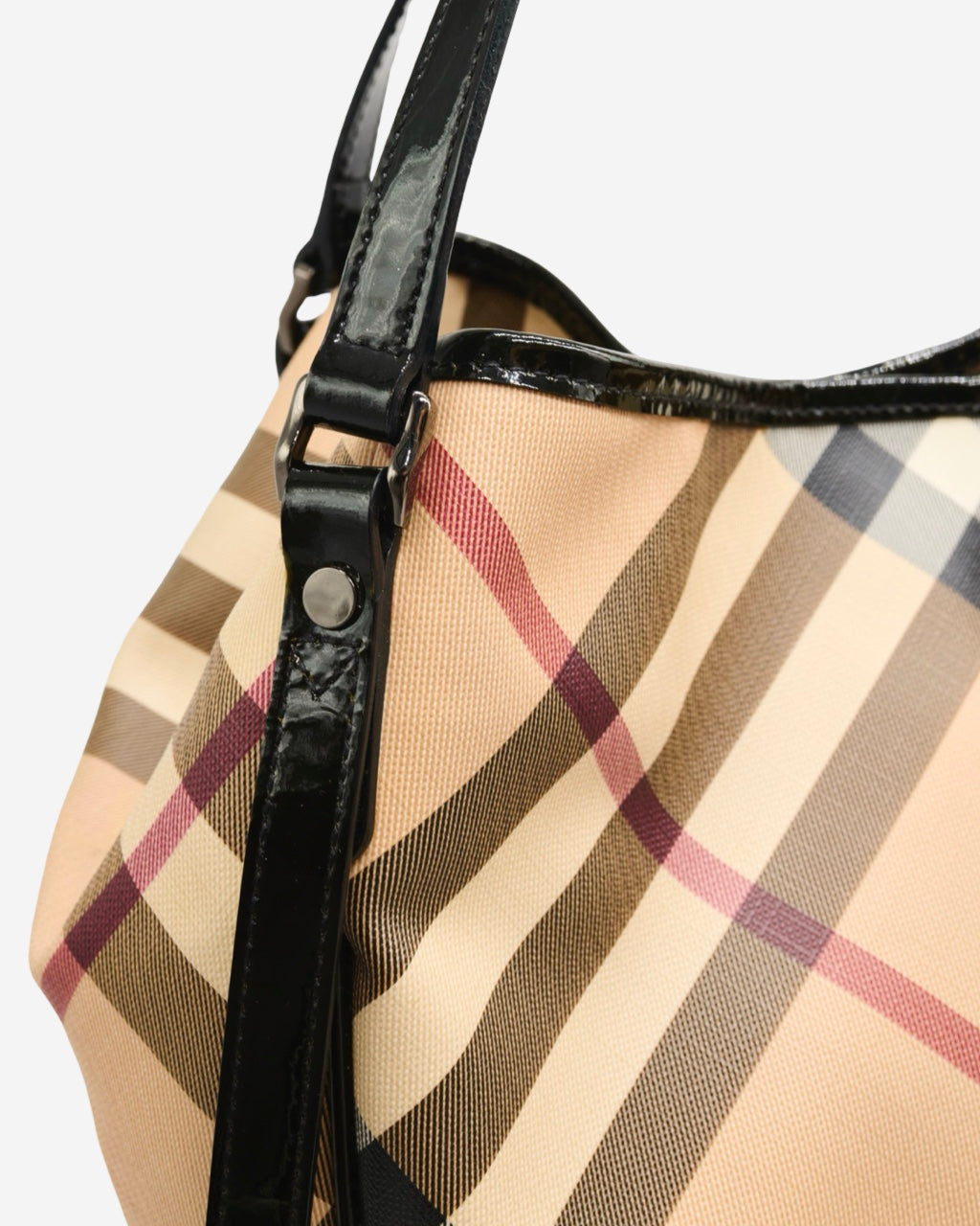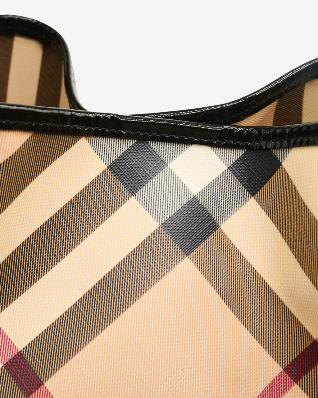 - Description: Burberry shoulder bag in beige nova check canvas, black patent leather trim, double fixed handle, magnetic button closure, beige textile interior lining, extra pouch with two-way closure, silver-tone hardware