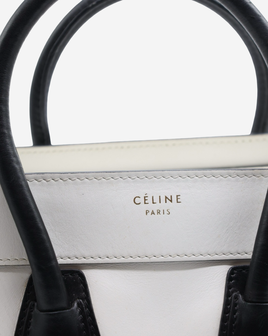 - Description: White leather handbag, double fixed top handle, front pocket, gold-tone engraved logo, black interior lining with pocket, gold-tone hardware