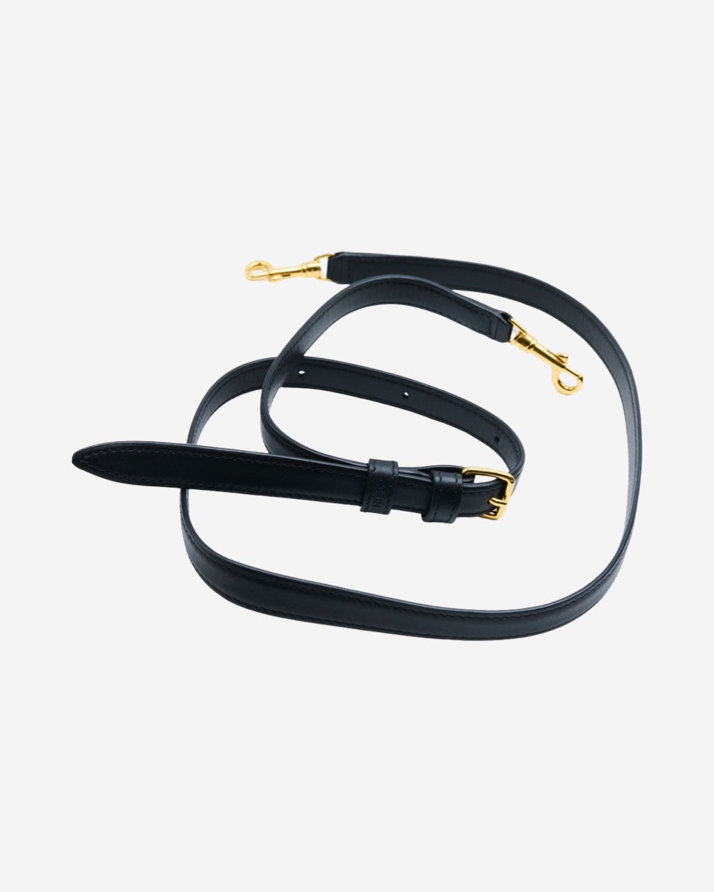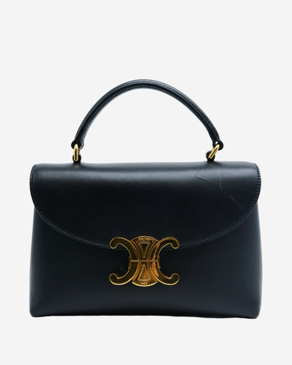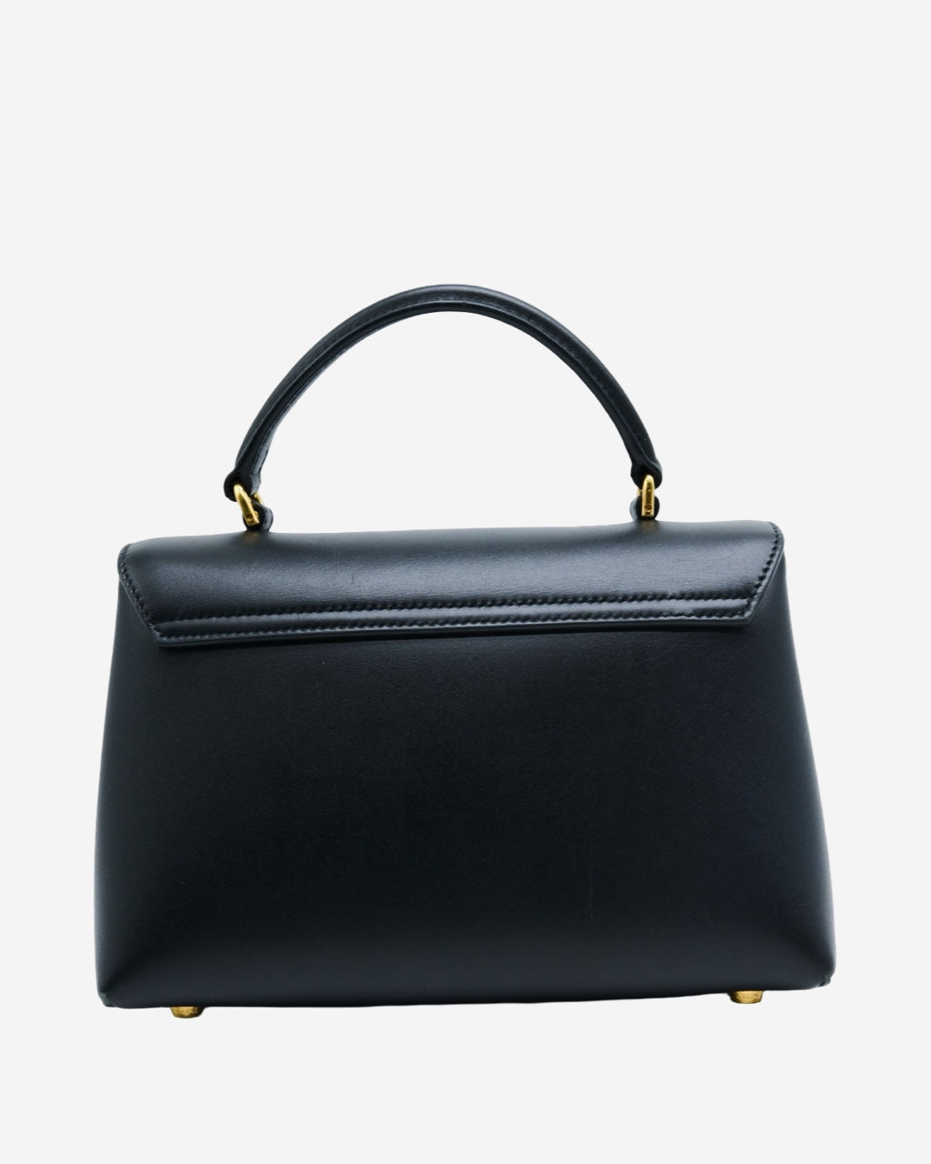 - Description: Black leather handbag, main opening with flap, front metal plate, top handle, black leather interior lining with pocket and two-way closure, gold-tone hardware