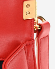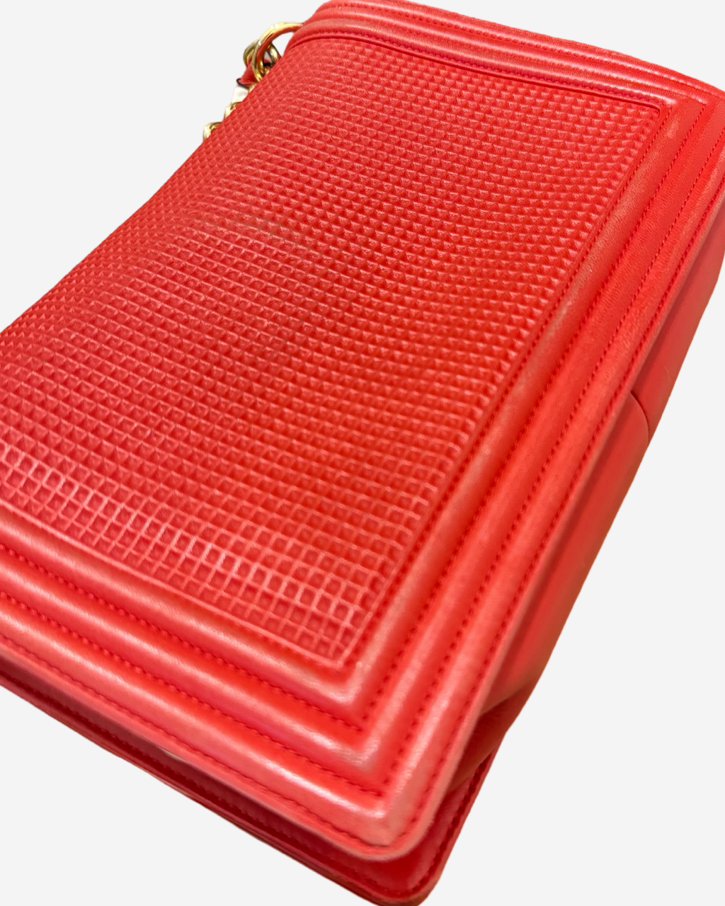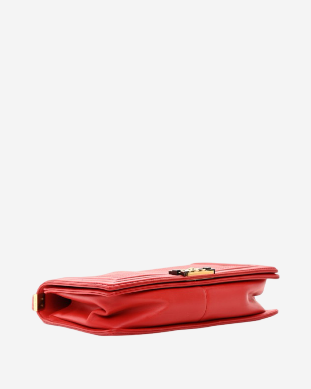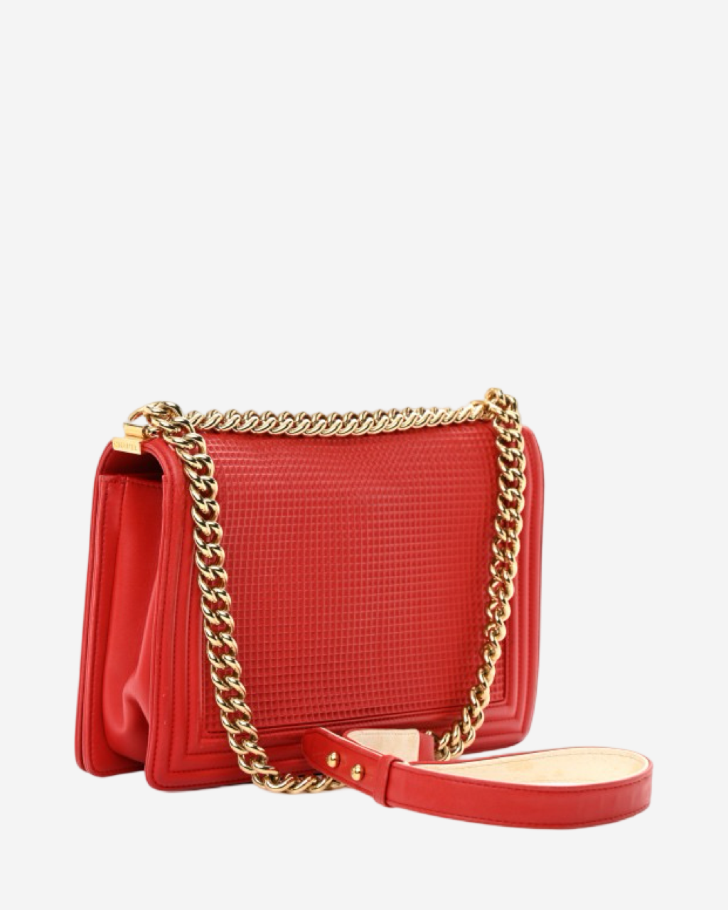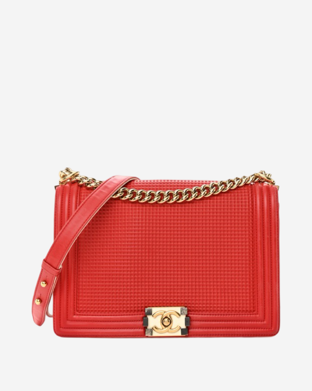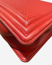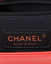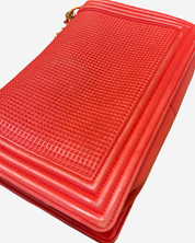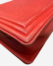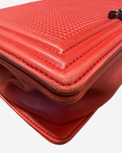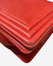 - Description: Chanel Boy Jumbo bag in red leather, signature CC clasp on front, flap opening, red lining, gold hardware