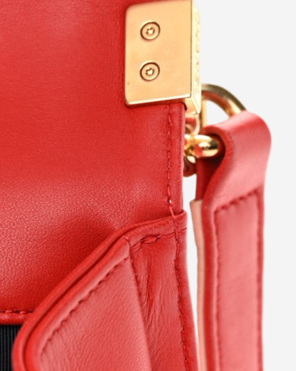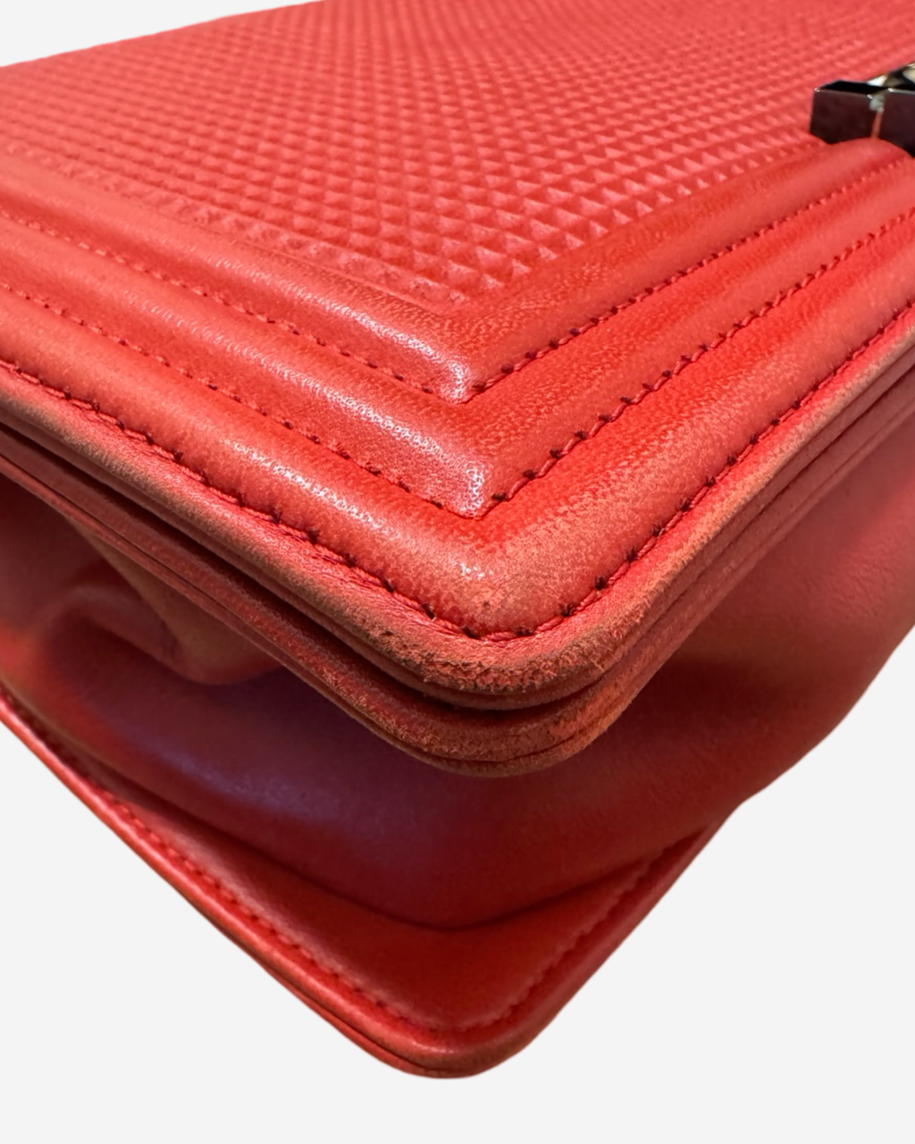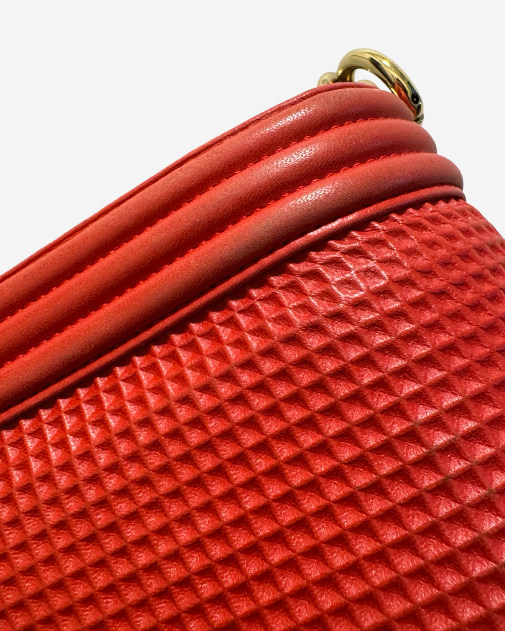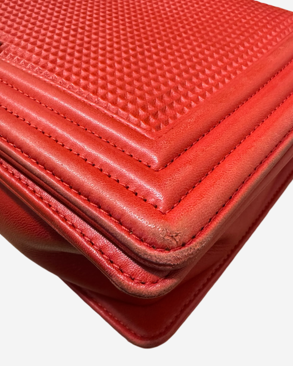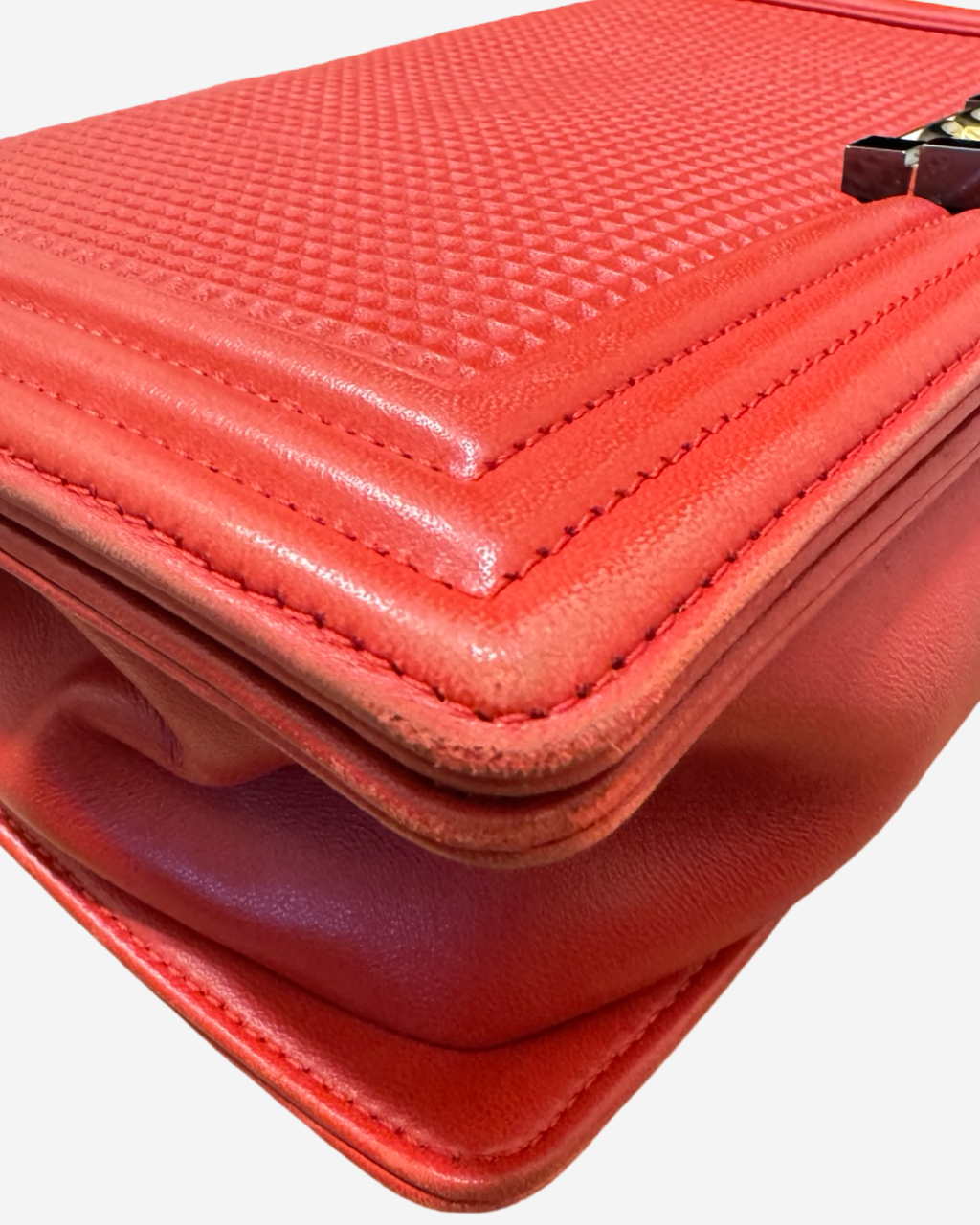 - Description: Chanel Boy Jumbo bag in red leather, signature CC clasp on front, flap opening, red lining, gold hardware