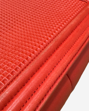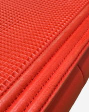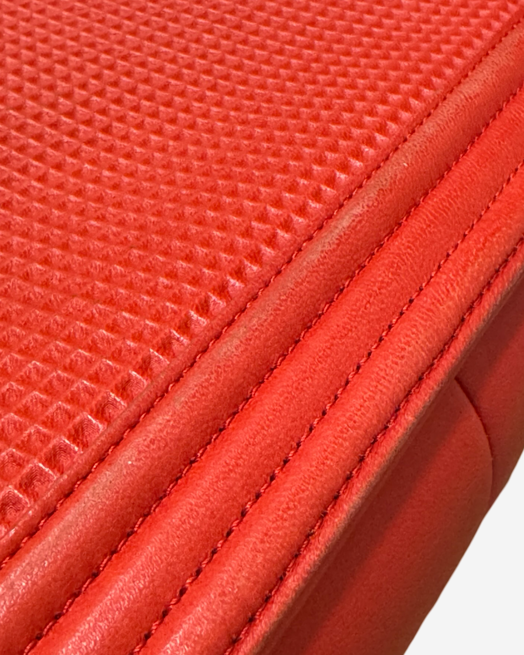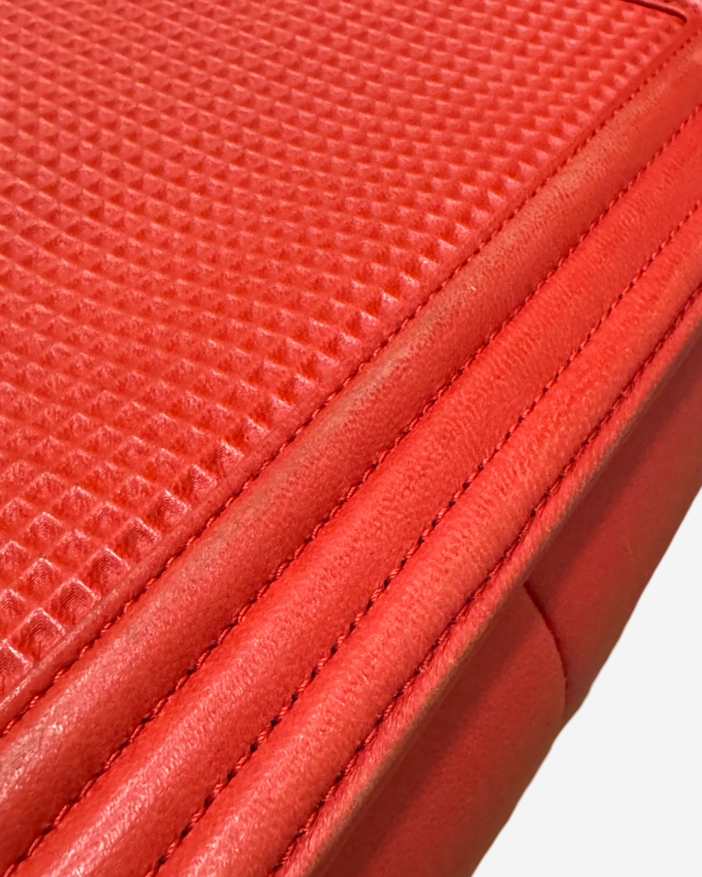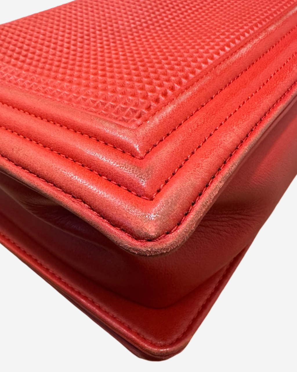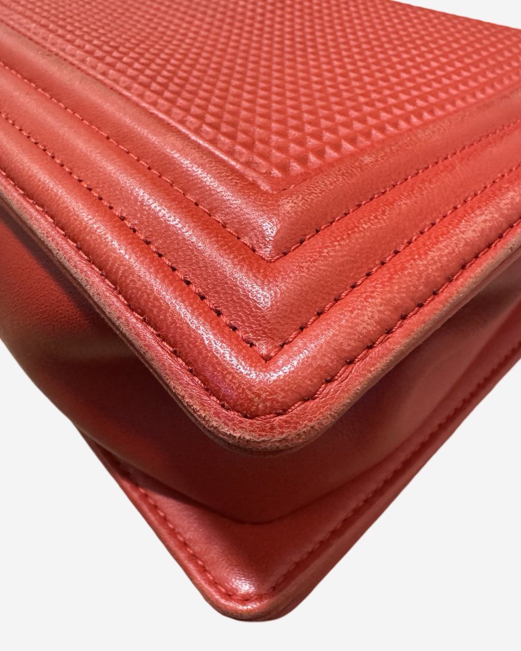 - Description: Chanel Boy Jumbo bag in red leather, signature CC clasp on front, flap opening, red lining, gold hardware