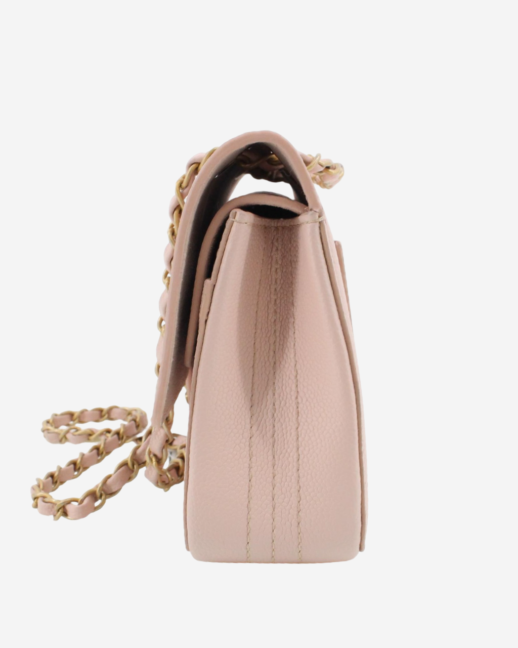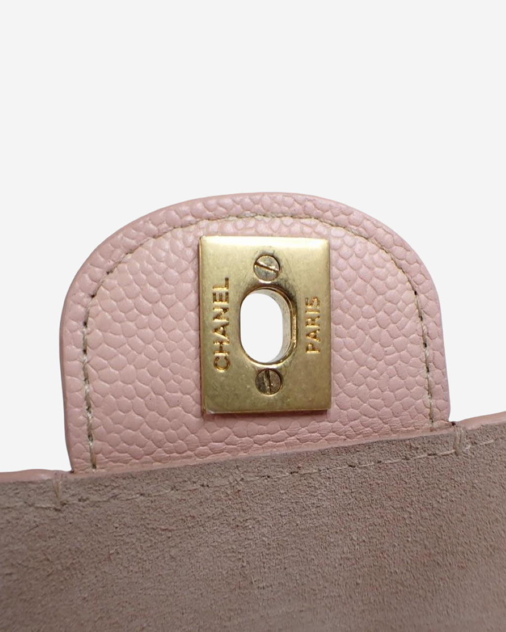 - Description: Chanel shoulder bag in caviar pink leather, long chain strap, main opening with flap and 'CC' turnlock clasp, suede interior lining with pockets, gold-tone hardware