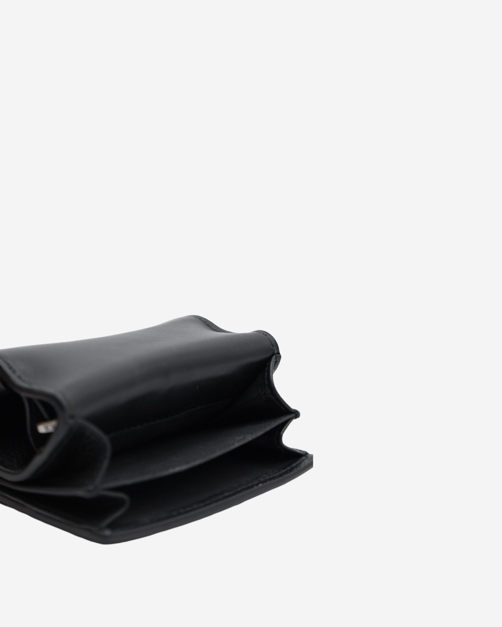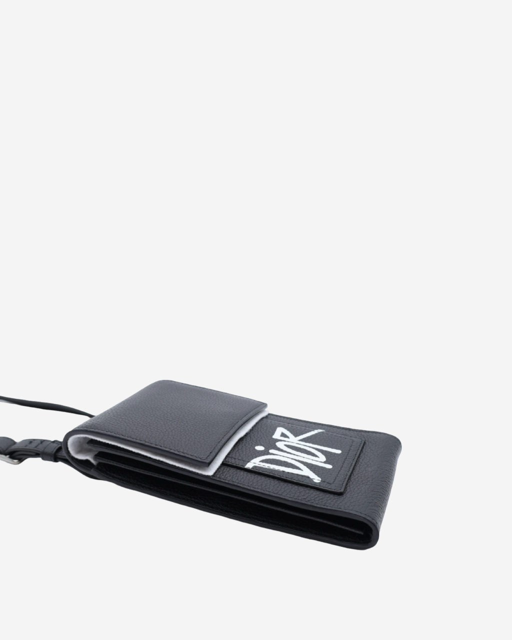 - Description: Black leather crossbody bag, white front logo, long fixed handle, silver-tone hardware