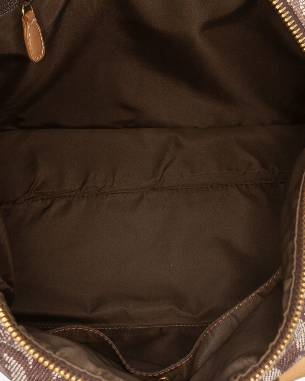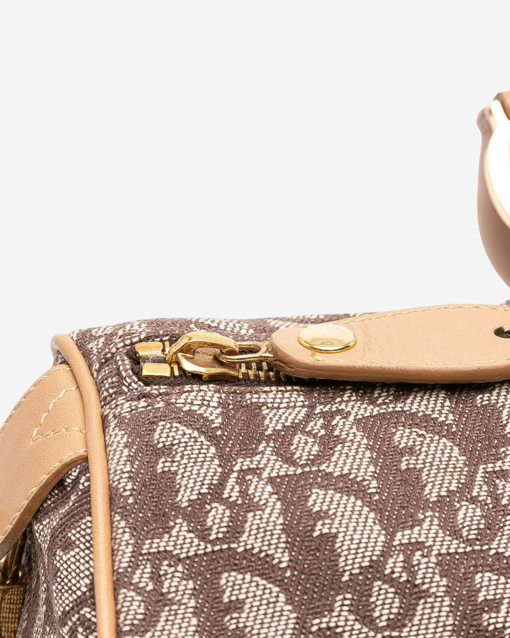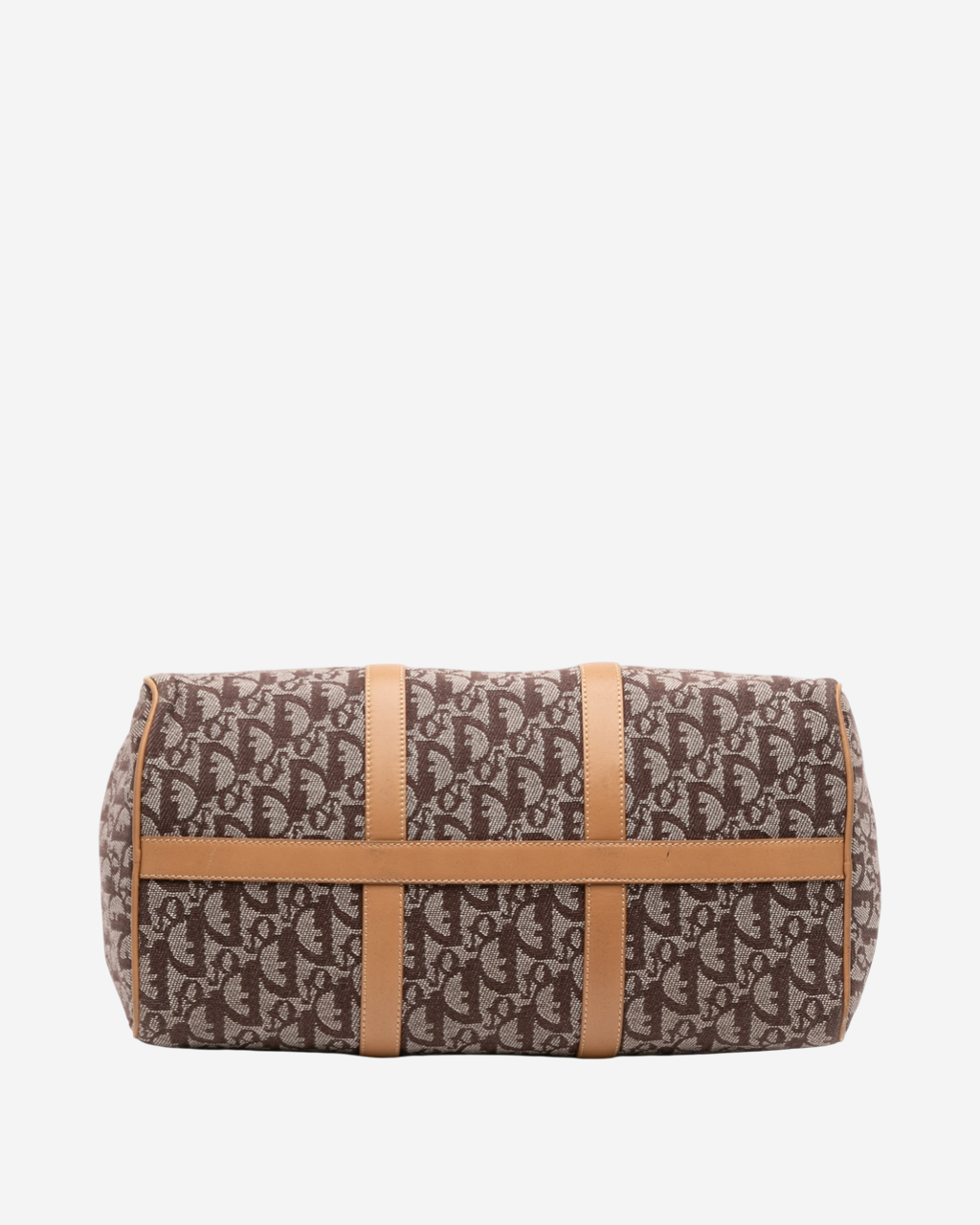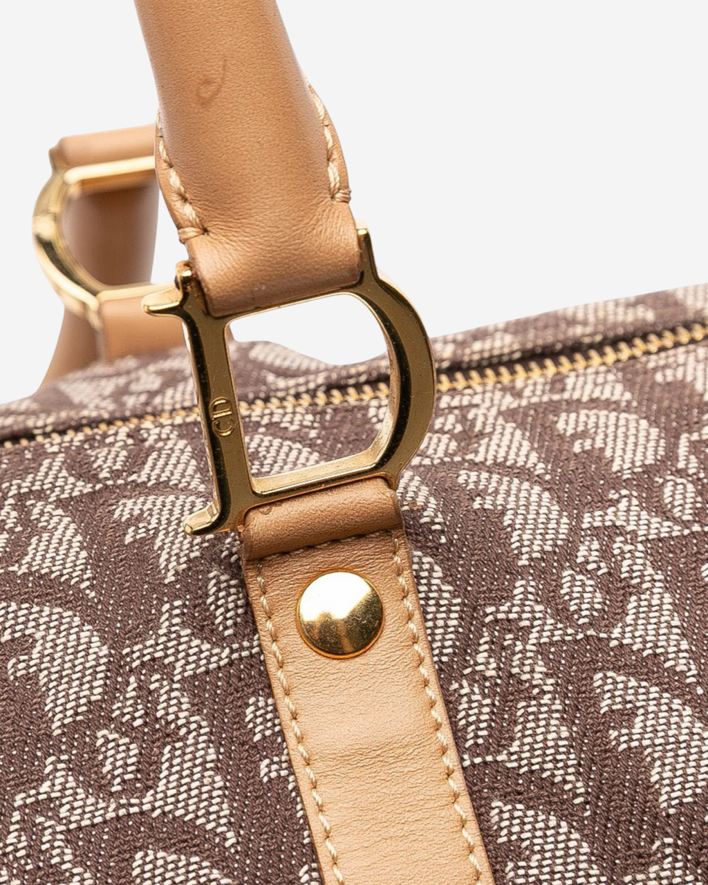 - Description: Dior handbag in brown trotter canvas, beige leather trim, double fixed handles, main opening with two-way zipper, textile lining with pocket, gold-tone hardware
