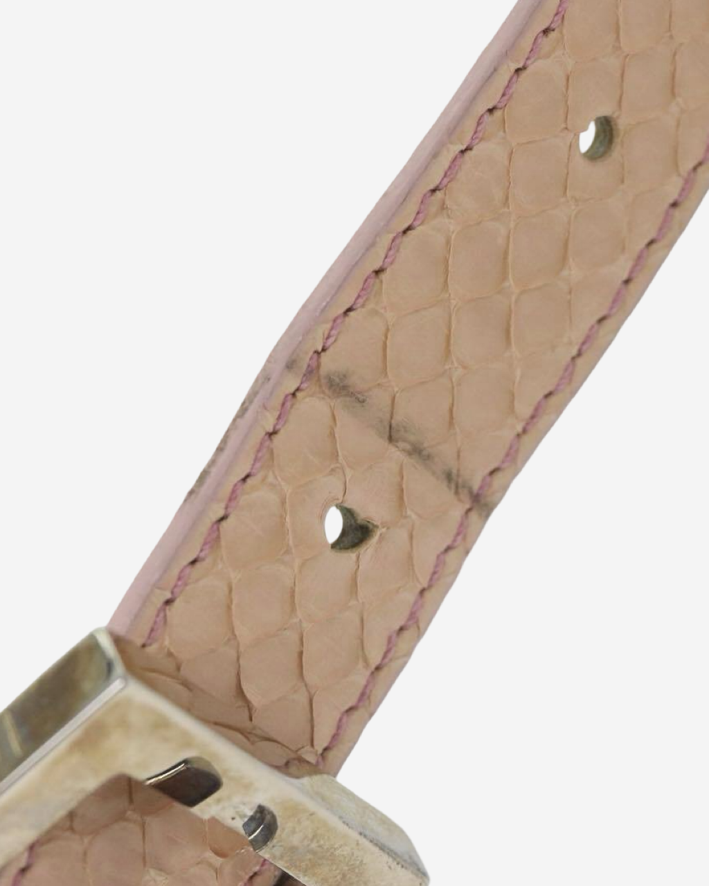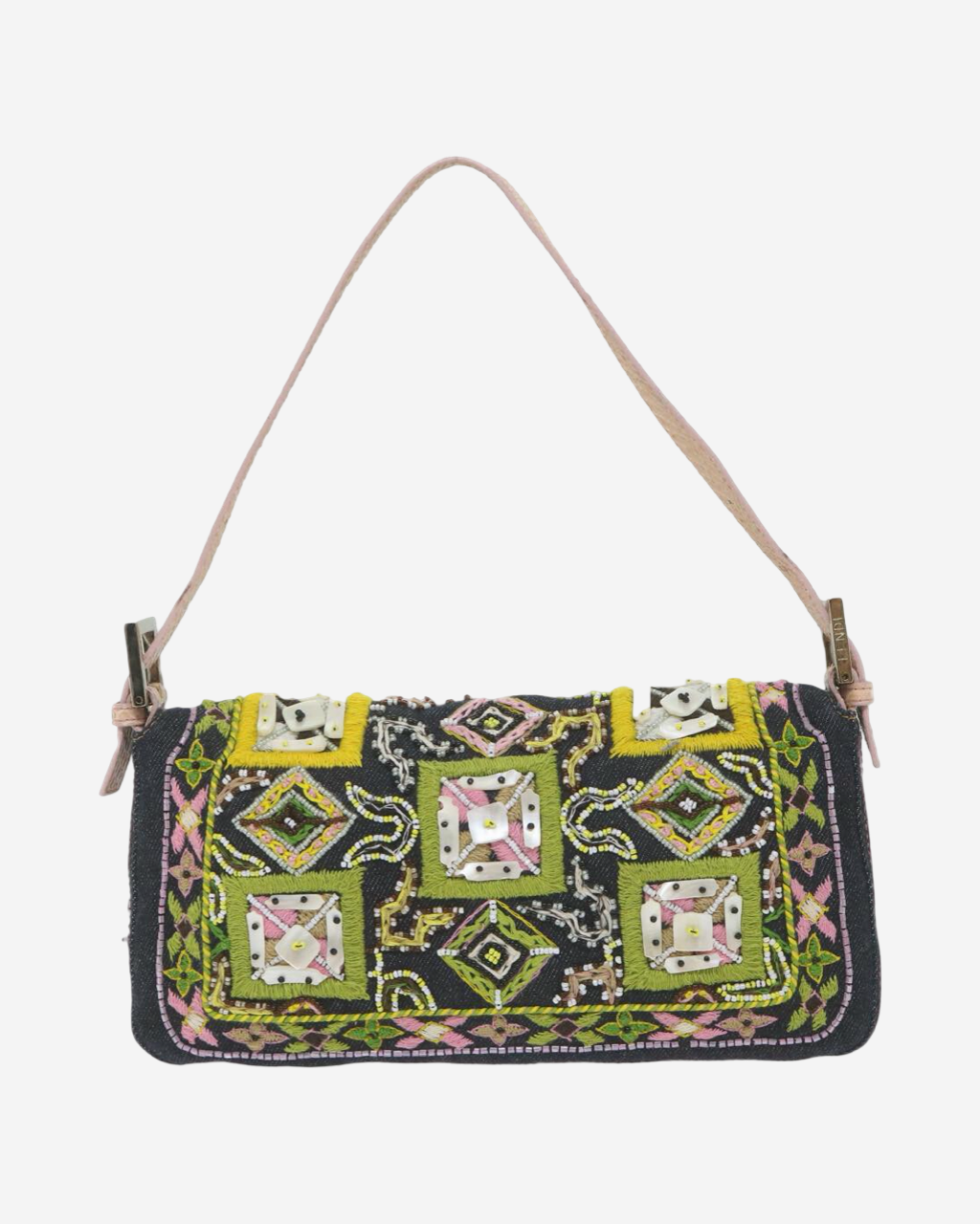 - Description: Fendi Baguette bag in blue denim, signature FF front clasp with green background, fixed pink snakeskin handle, flap opening with magnetic closure, bead and embroidery motif, pink textile lining with pocket and double-sided closure, silver-tone hardware