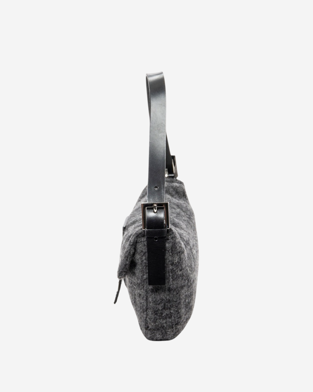 - Description: Wool baguette with magnetic front clasp, leather shoulder strap, main opening with zipper in interior pocket, silver-colored hardware