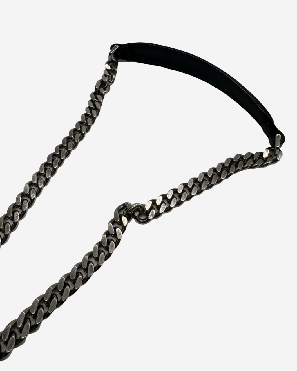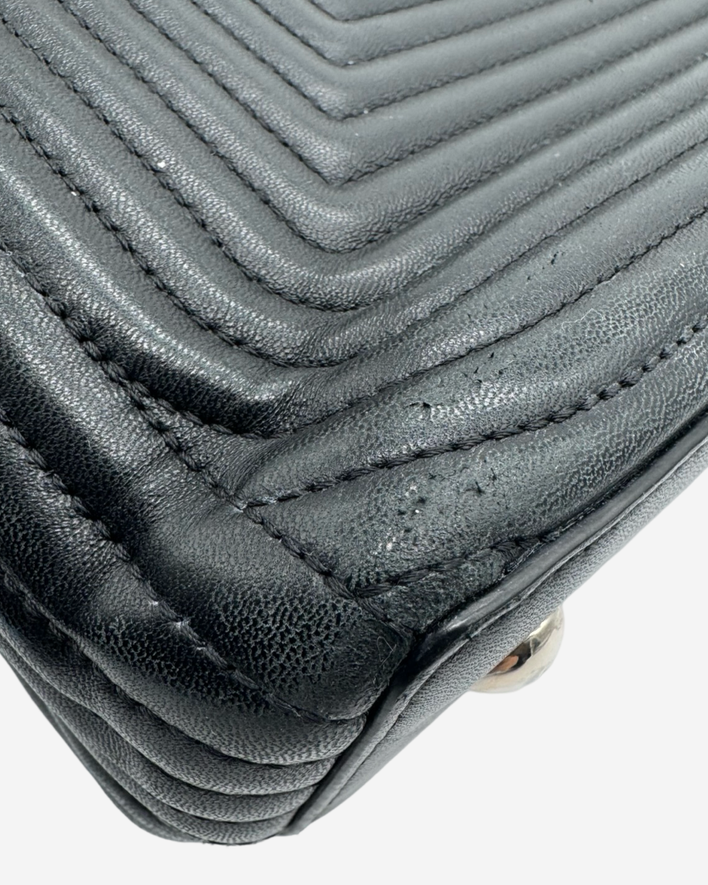 - Description: Black leather bag, front engraved logo, fixed top handle, black interior lining, silver-tone hardware