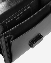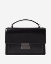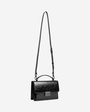 - Description: Black patent leather handbag, long crossbody strap, flap opening, silver-tone hardware