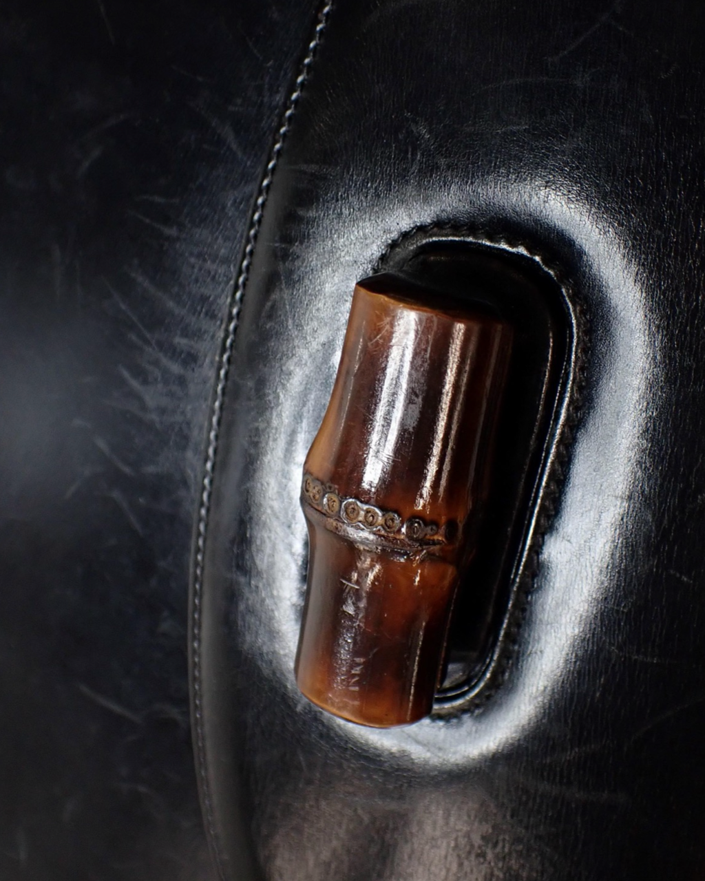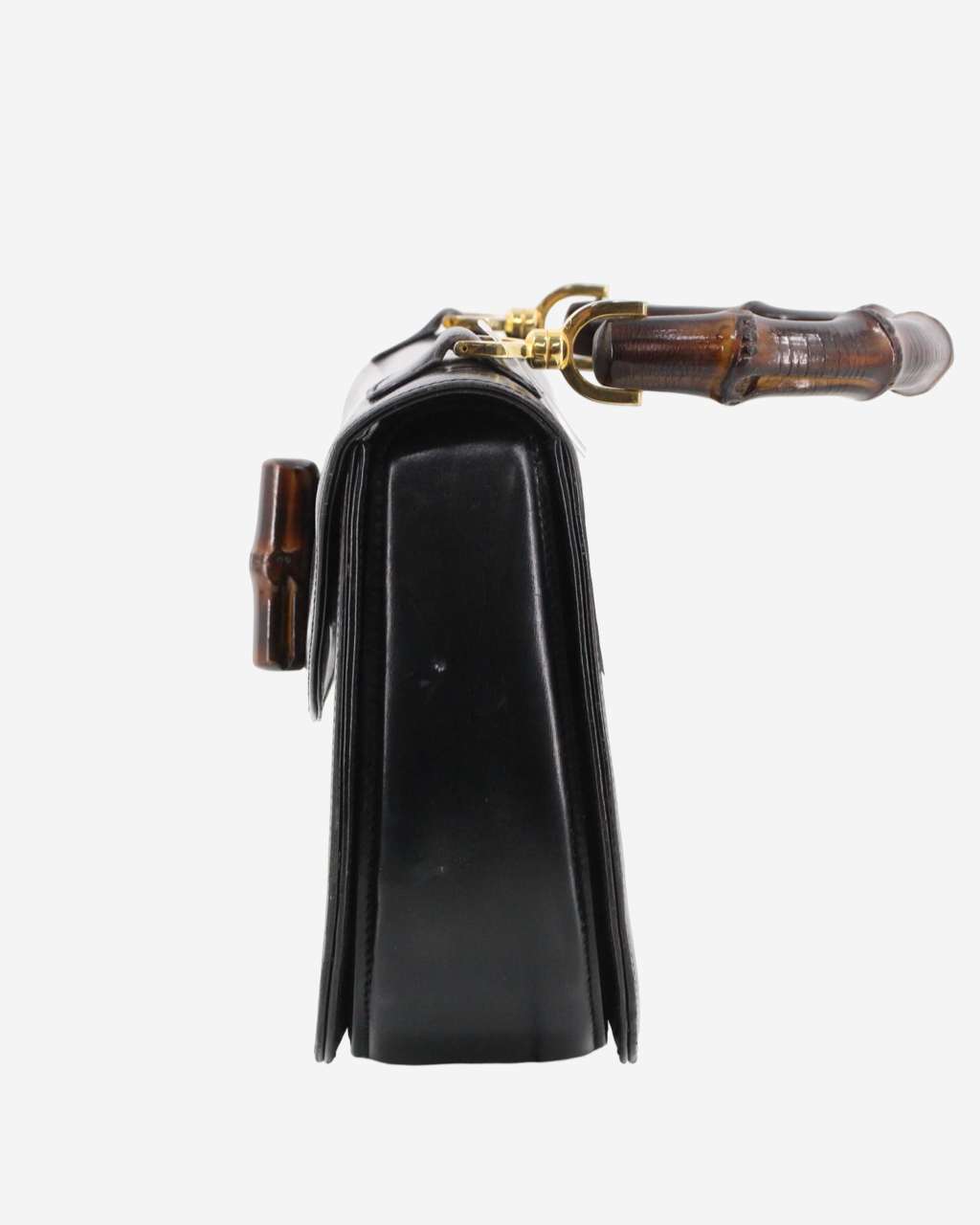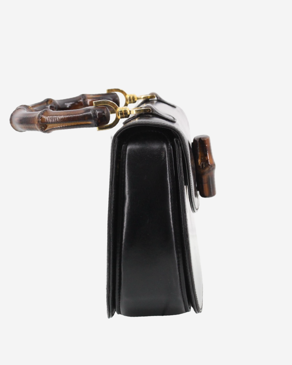 - Description: Gucci Bamboo handbag in black leather, signature fixed bamboo handle, front clasp, beige leather lining with pocket and two-way closure, gold-tone hardware