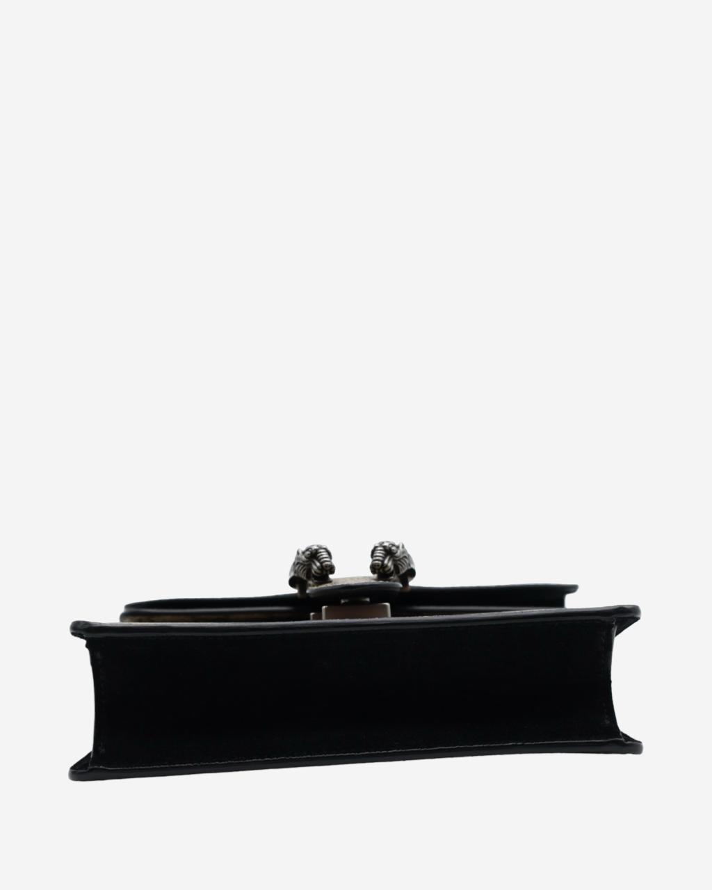 - Description: Canvas crossbody bag, signature front hardware clasp, long chain handle, black suede panels, silver-tone hardware