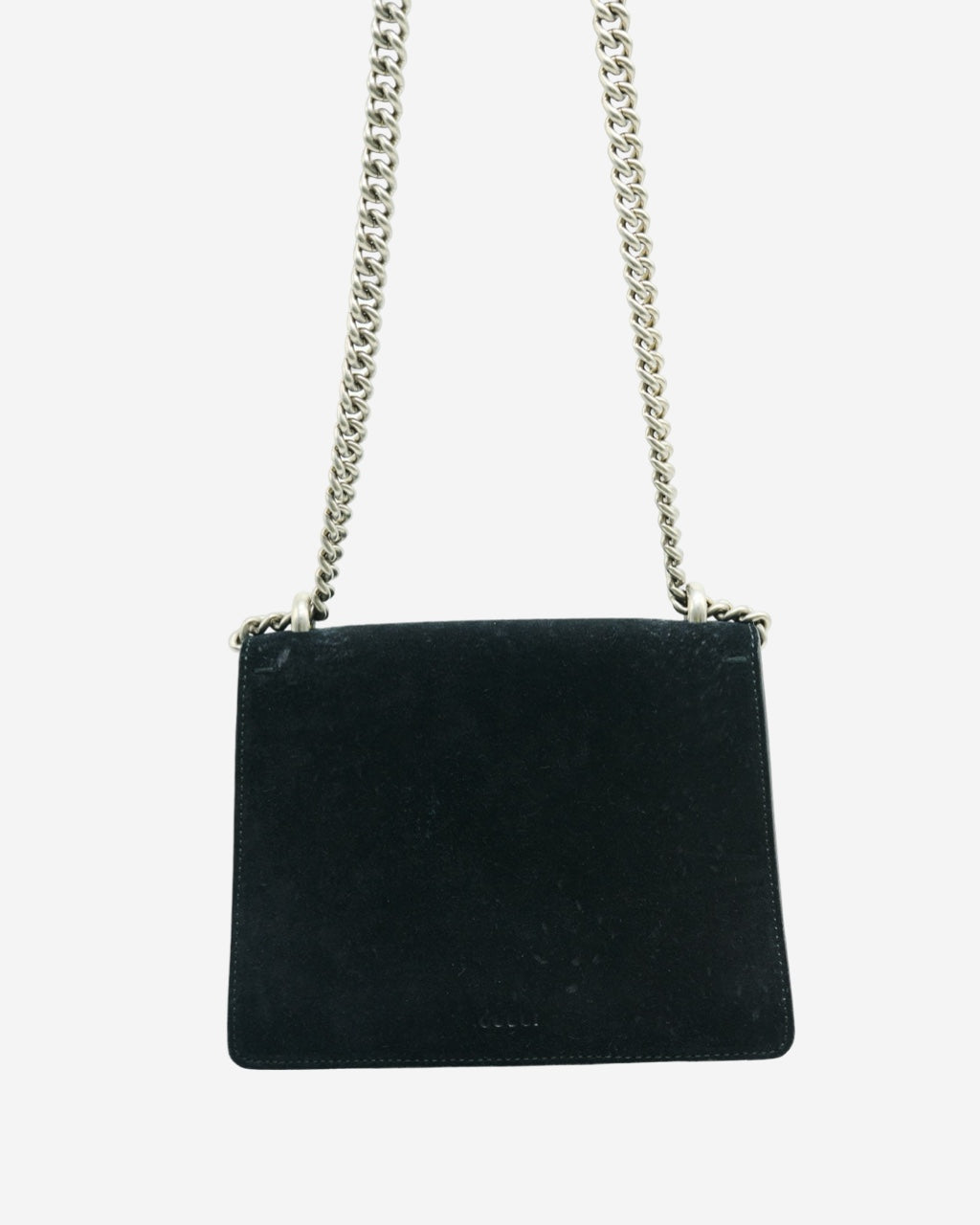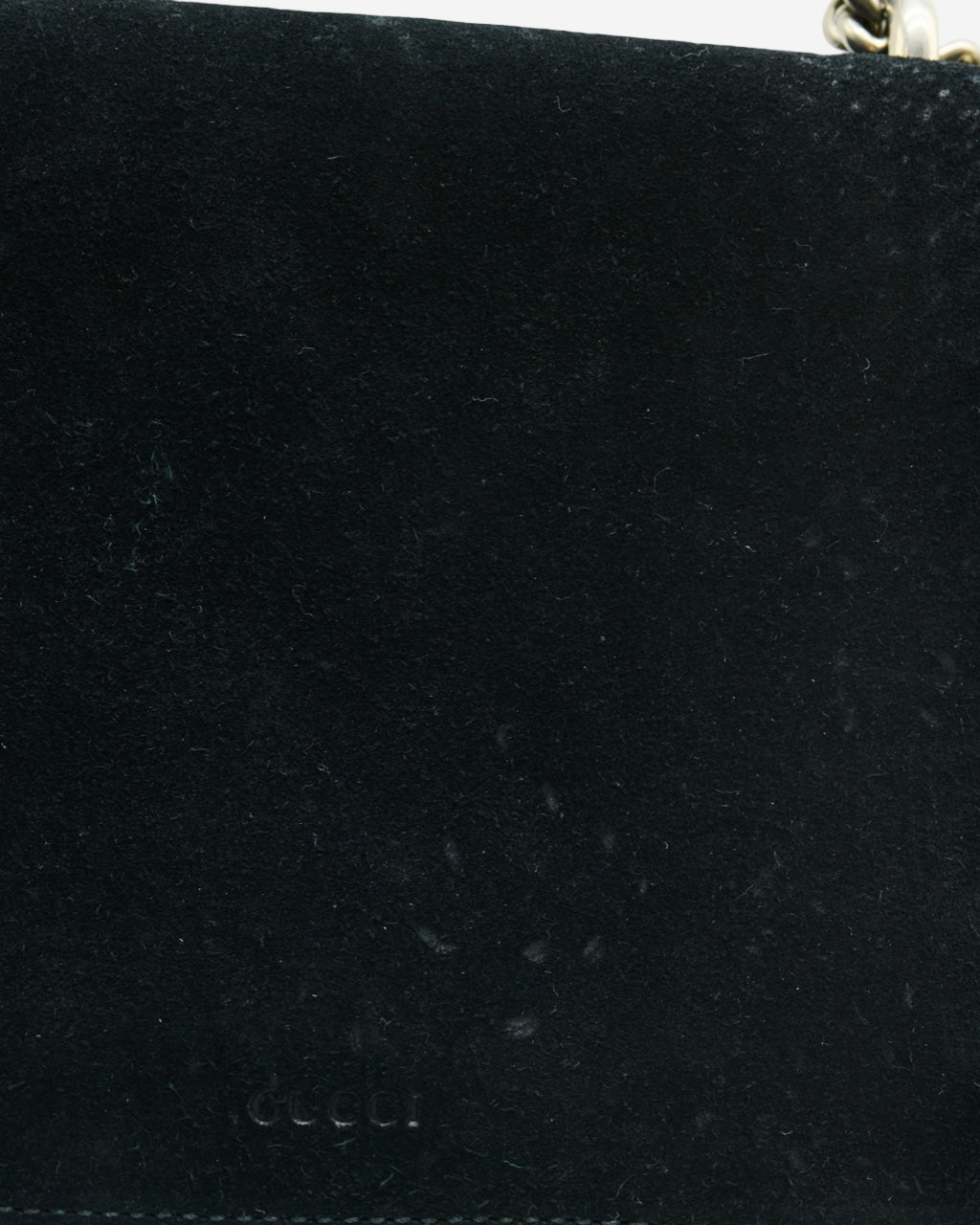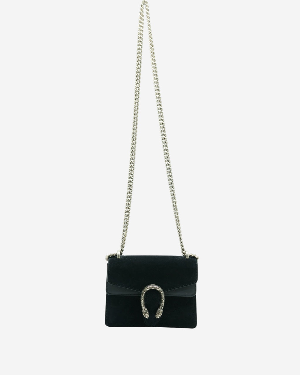 - Description: Gucci crossbody bag in black suede, front horseshoe, main opening with flap and metal clasp, long movable chain handle, black leather interior lining, silver-tone hardware