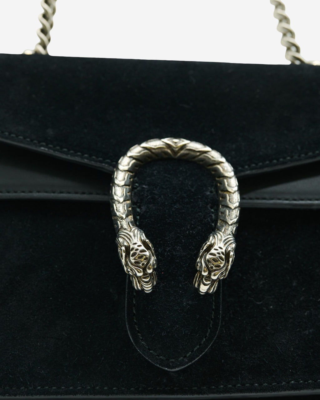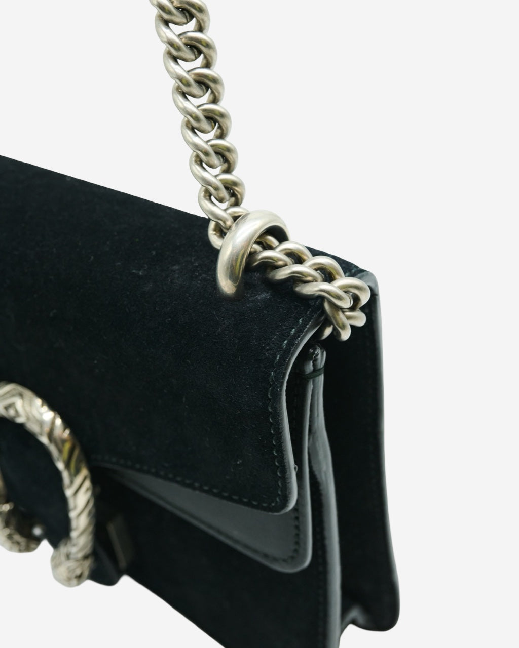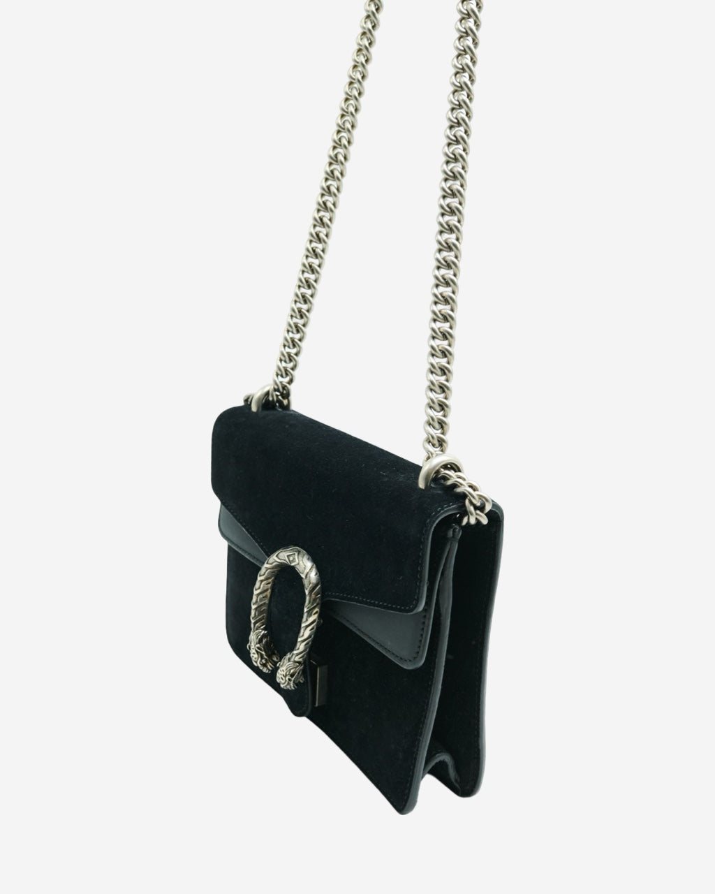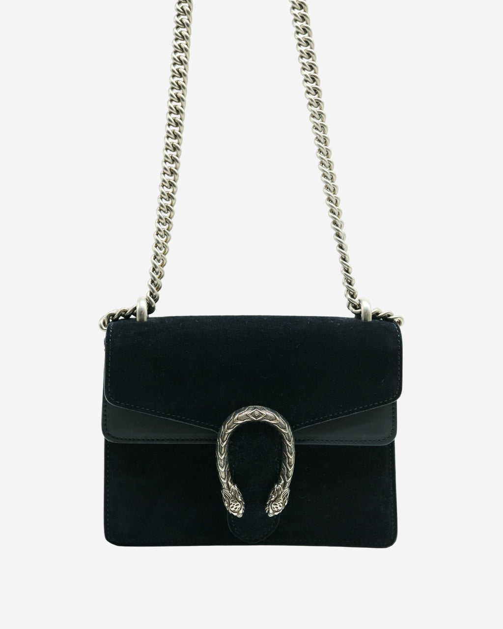 - Description: Gucci crossbody bag in black suede, front horseshoe, main opening with flap and metal clasp, long movable chain handle, black leather interior lining, silver-tone hardware