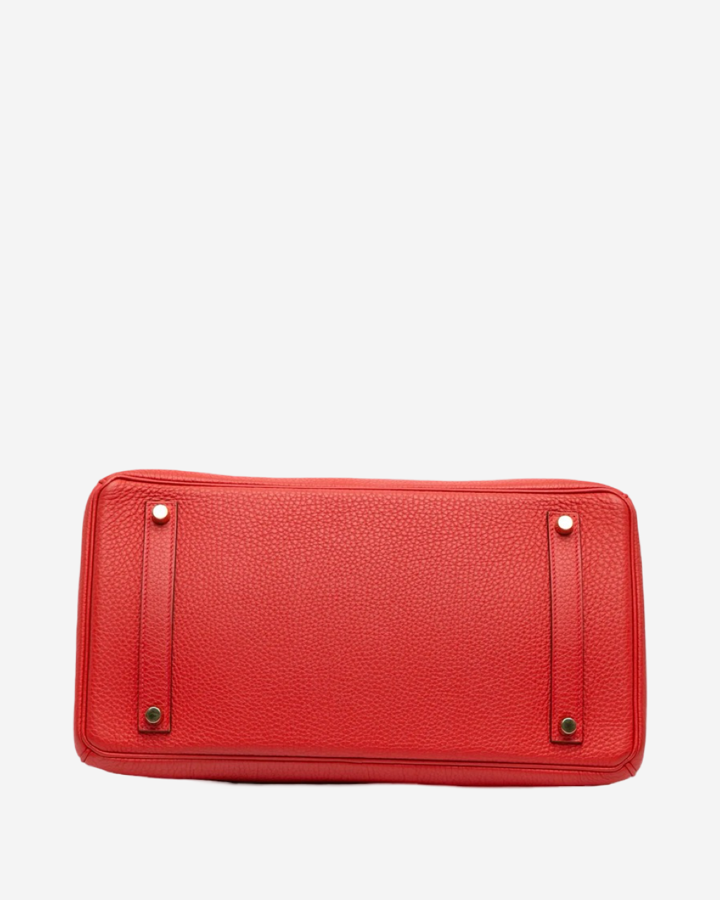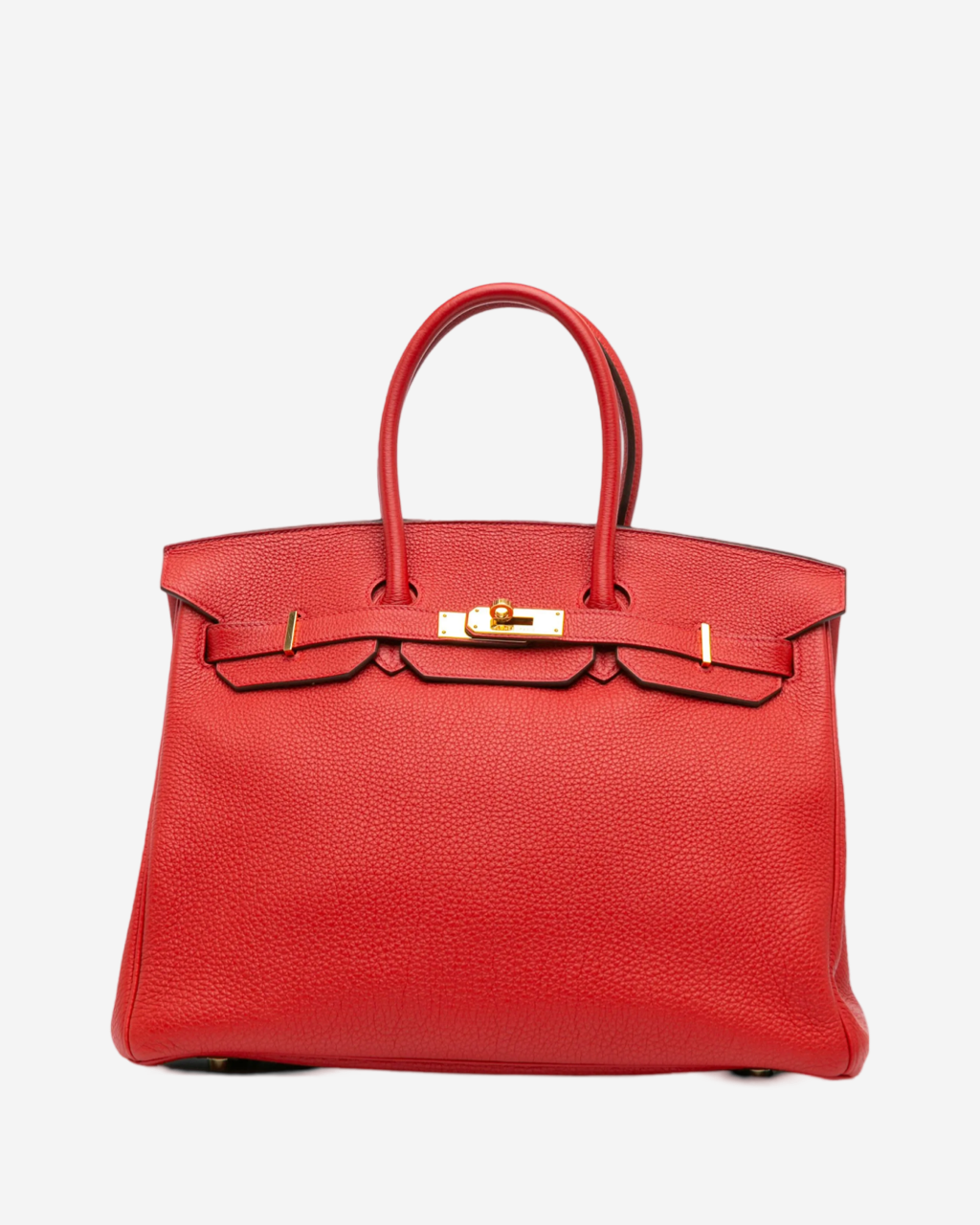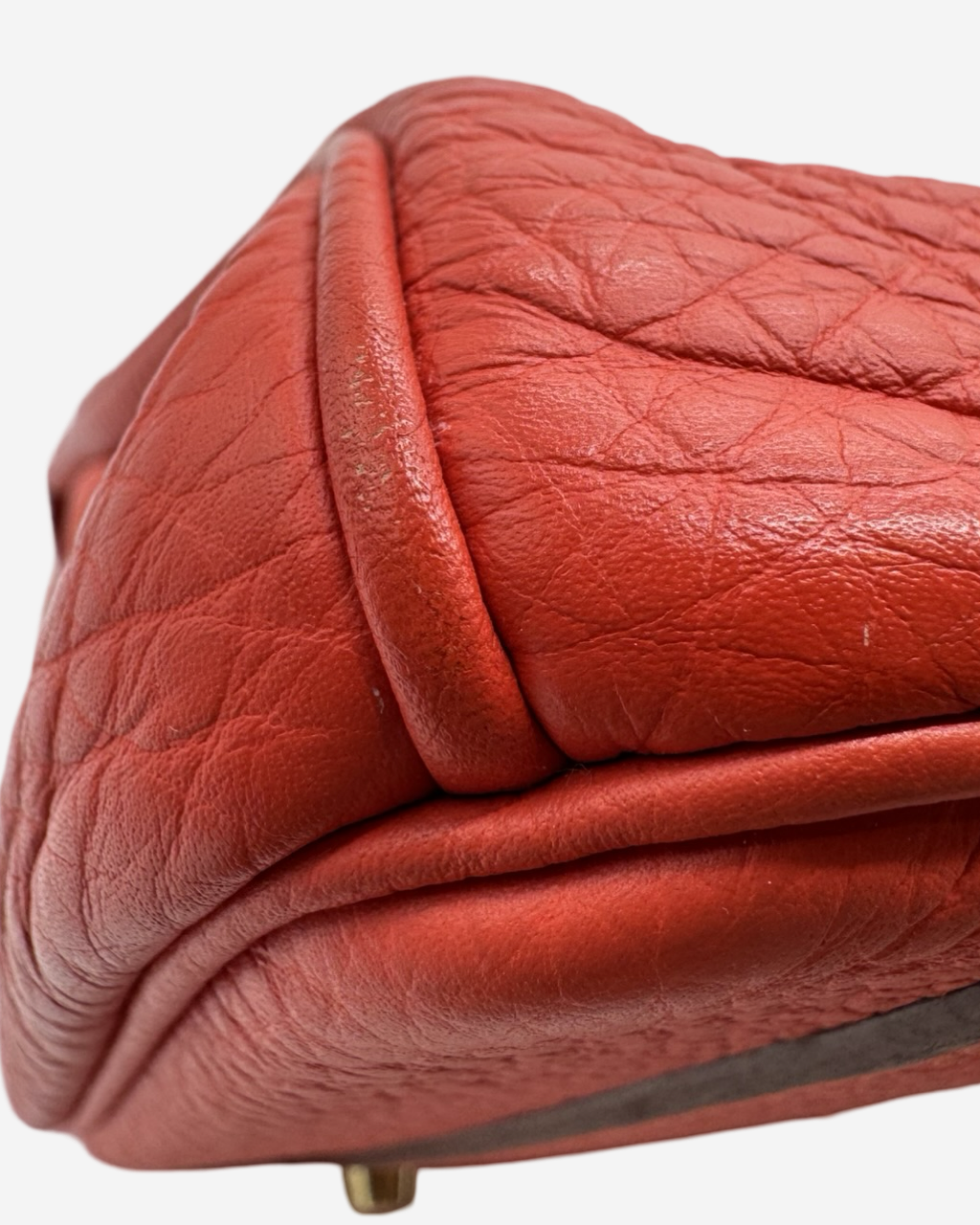 - Description: Handbag with rigid handle, signature front clasp, leather interior, interior zipper pocket, gold-tone hardware