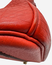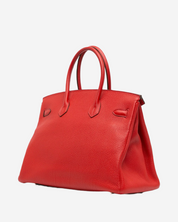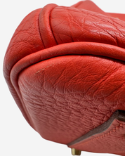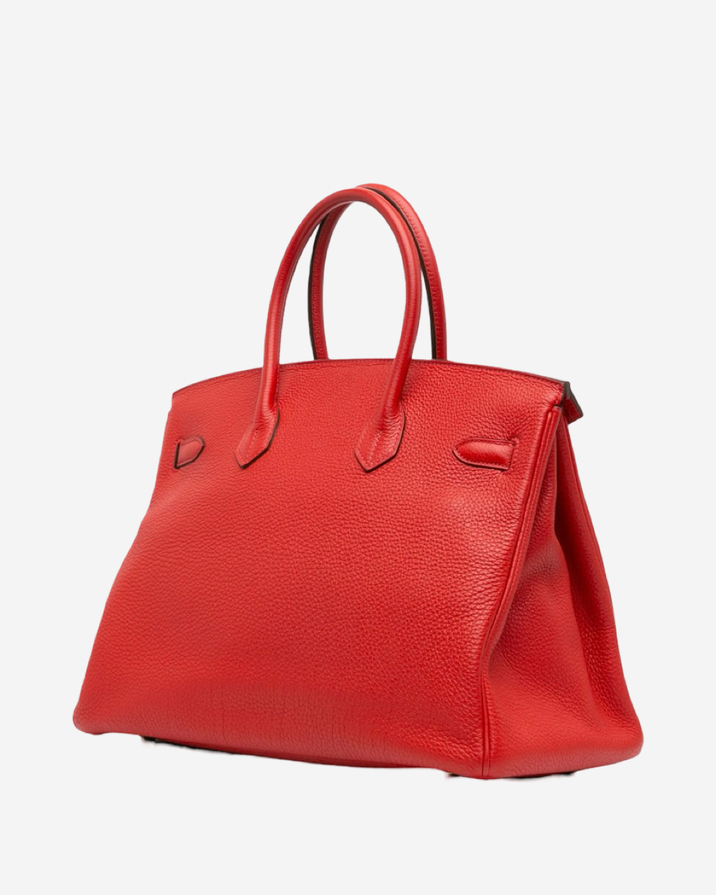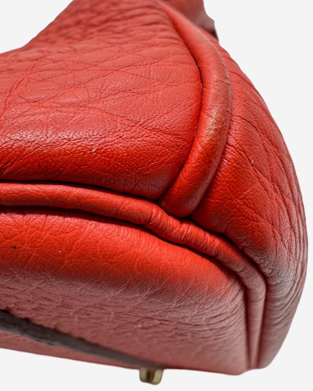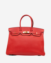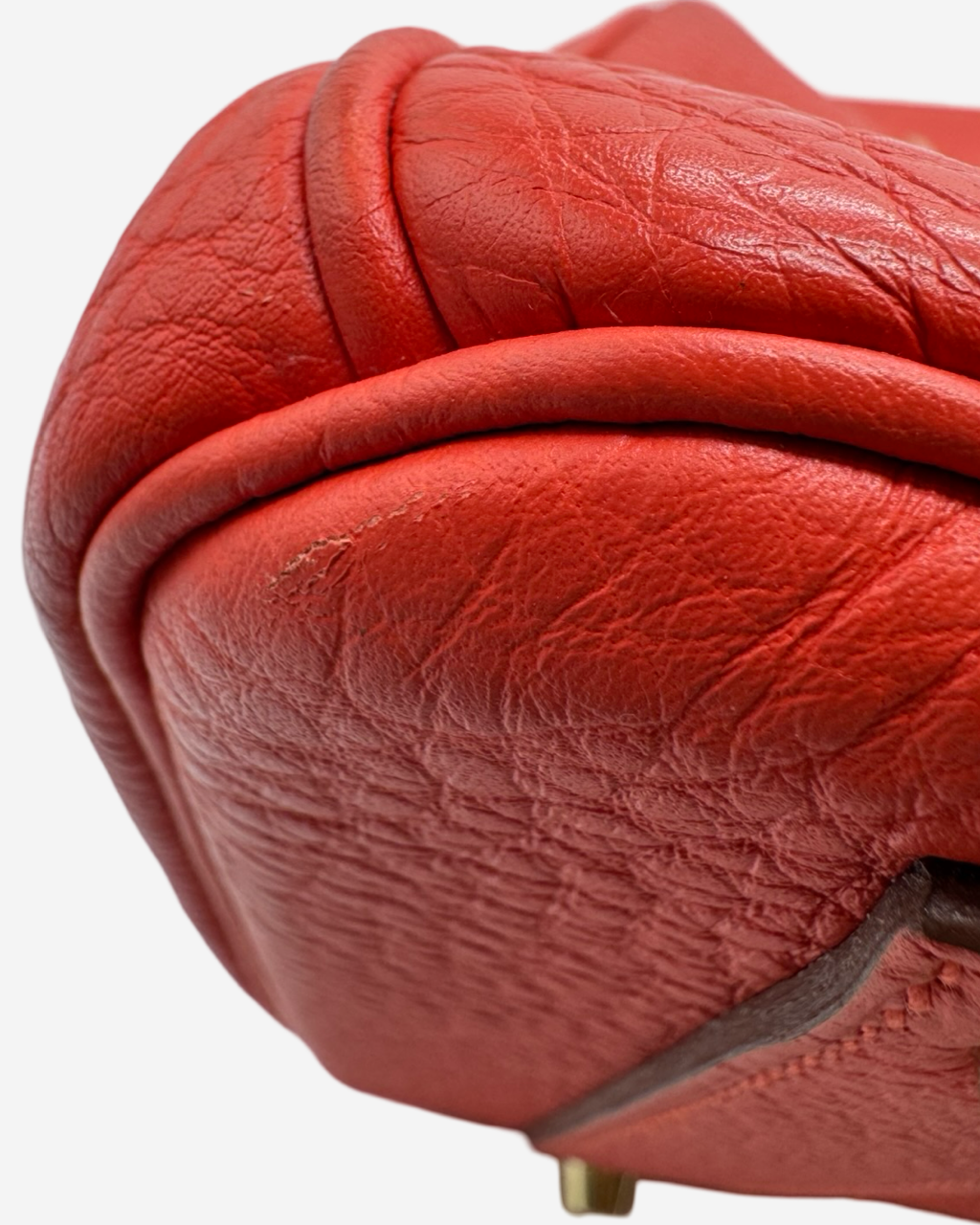 - Description: Handbag with rigid handle, signature front clasp, leather interior, interior zipper pocket, gold-tone hardware