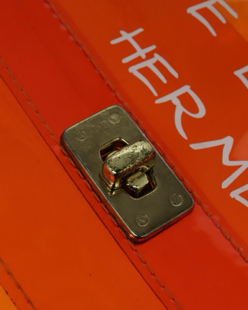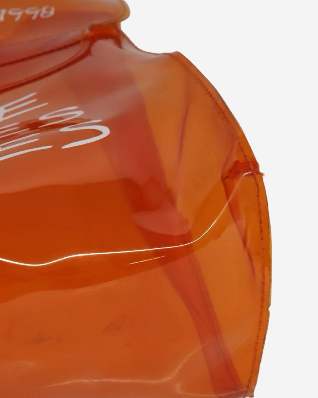 - Description: Transparent PVC handbag with engravings, front clasp, fixed handle, designed by Maison Margiela in the 90s