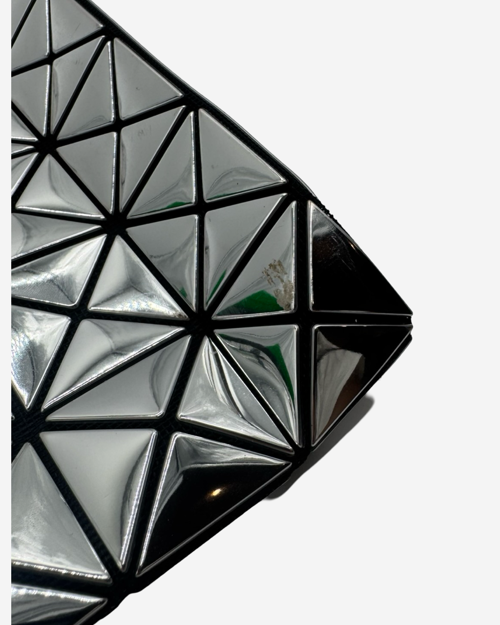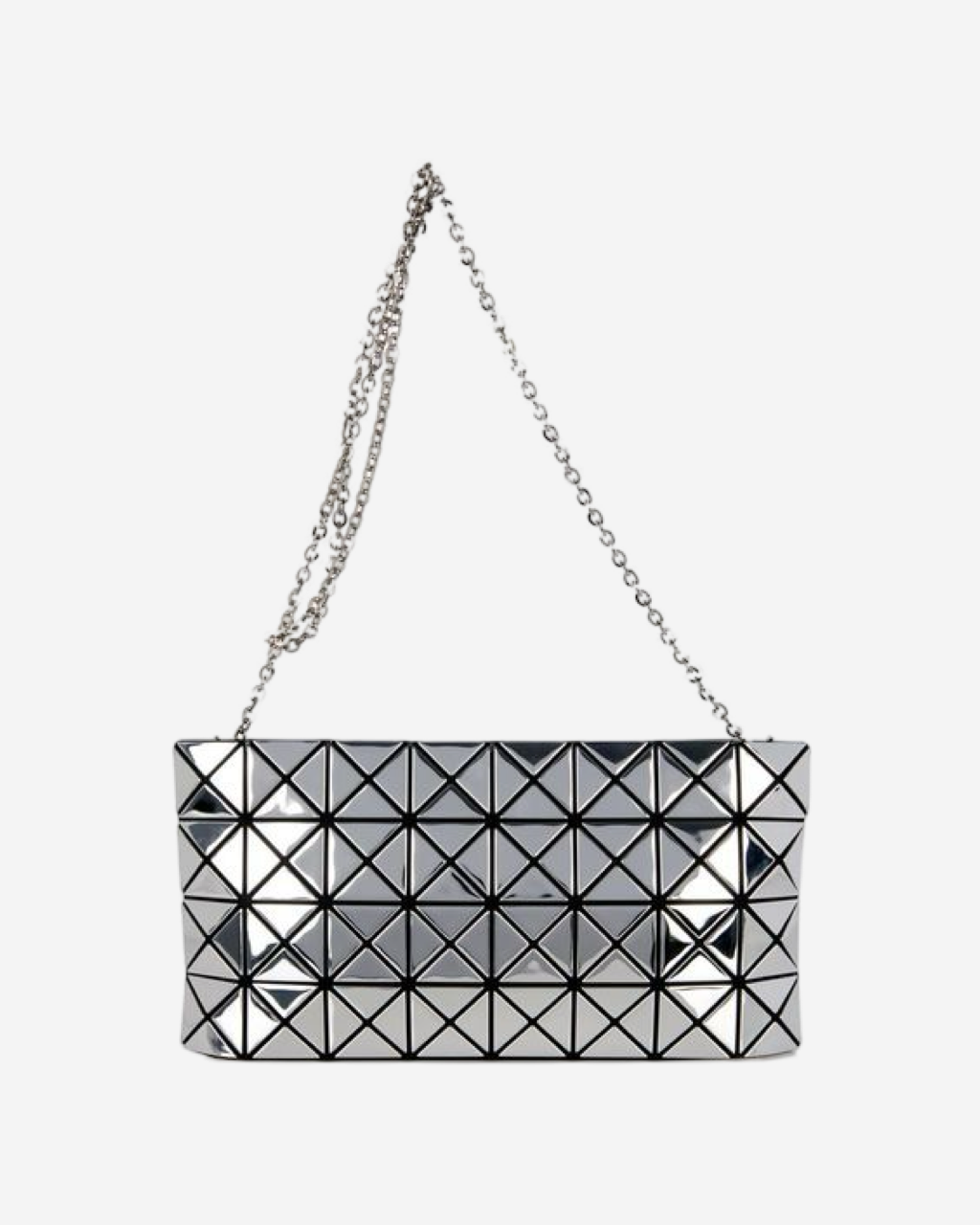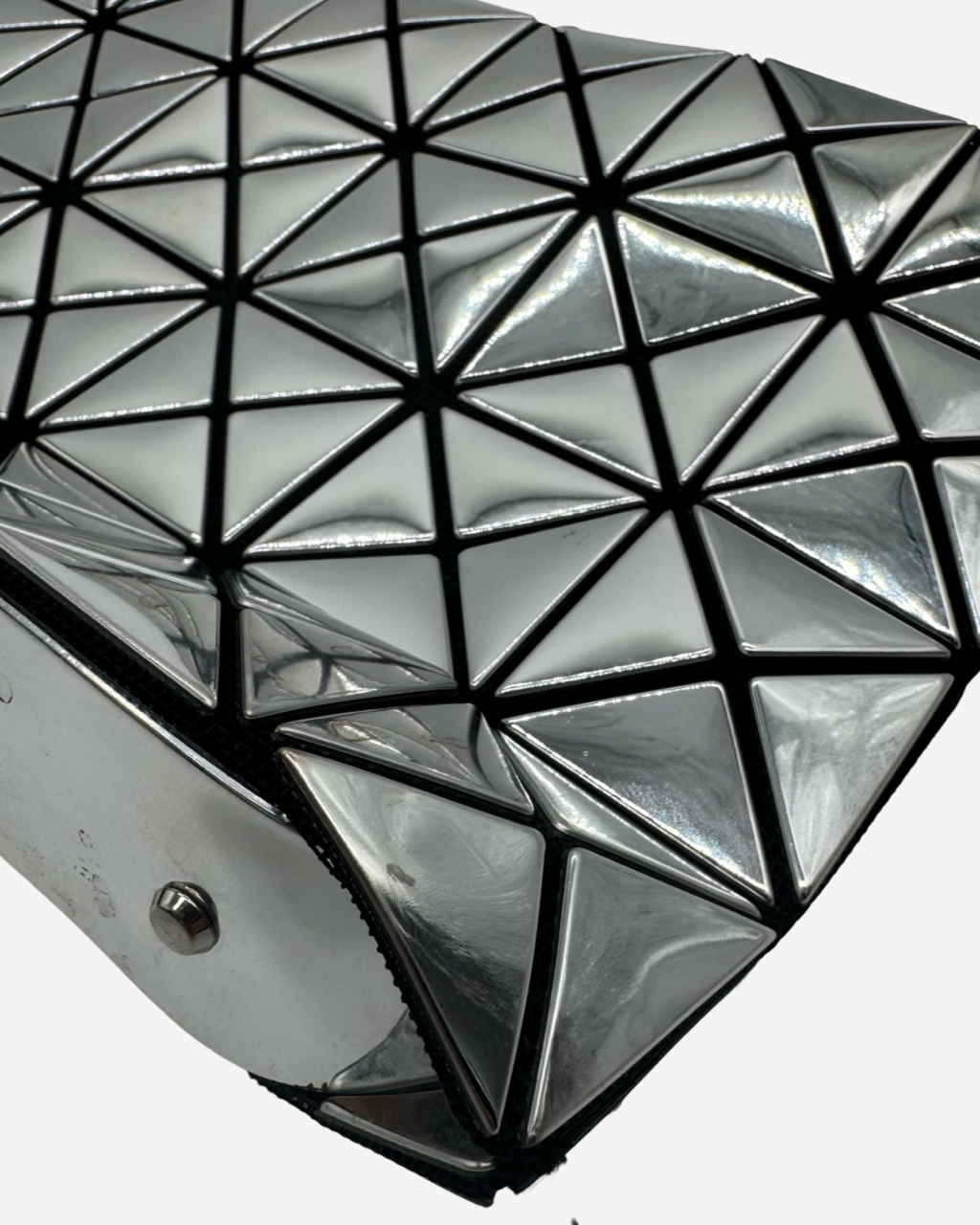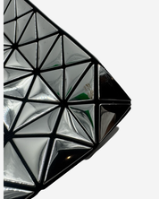 - Description: Black nylon crossbody bag with iridescent triangular panels, top closure, long chain handle, silver-tone hardware