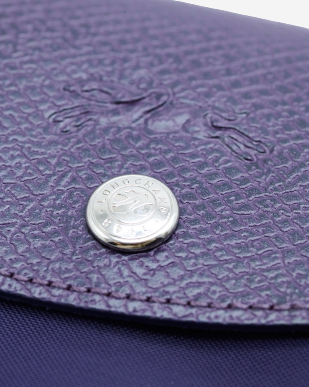 - Description: Purple handbag, double fixed handle at the top, flap opening with snap closure at the front, top closure, engraving on the back