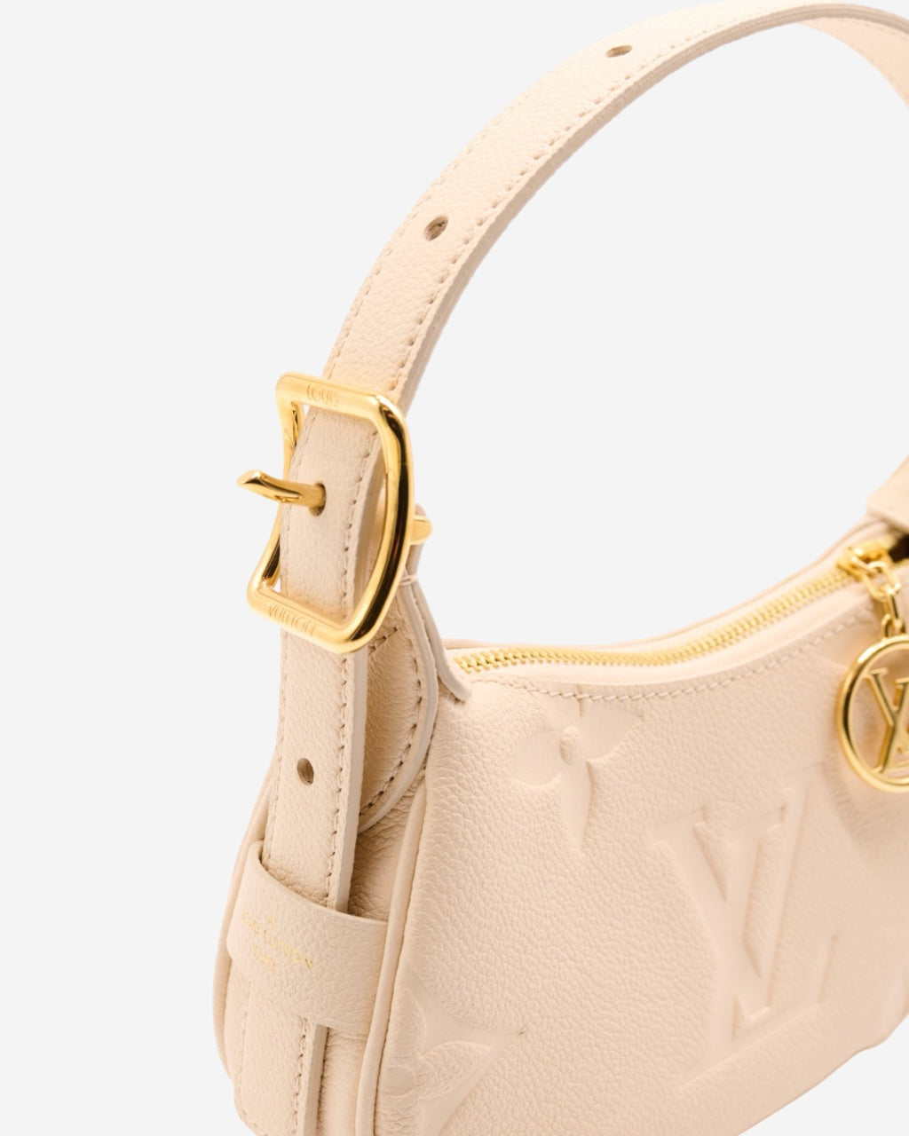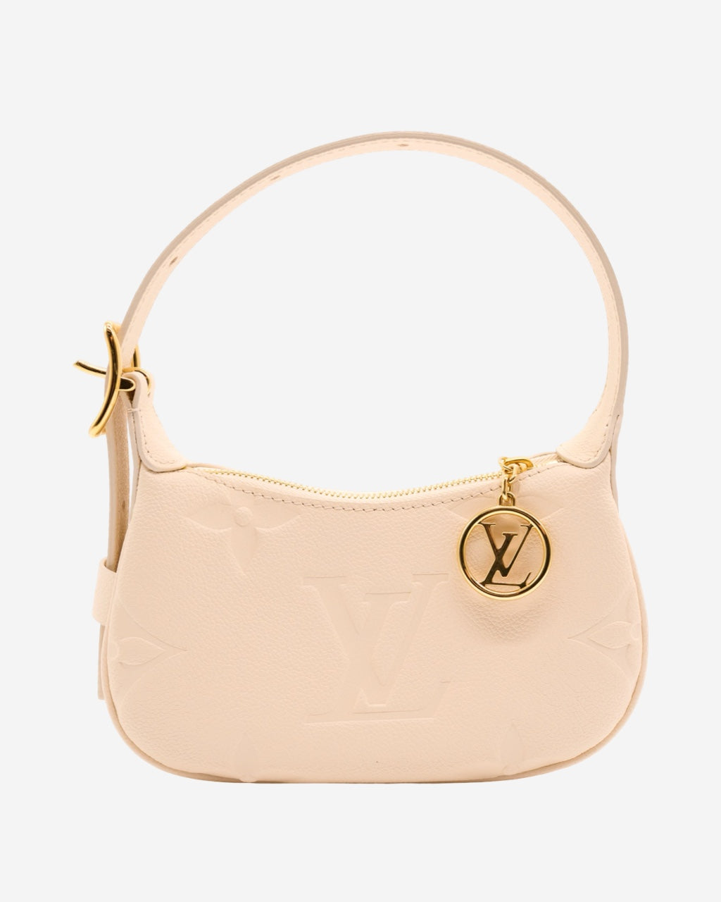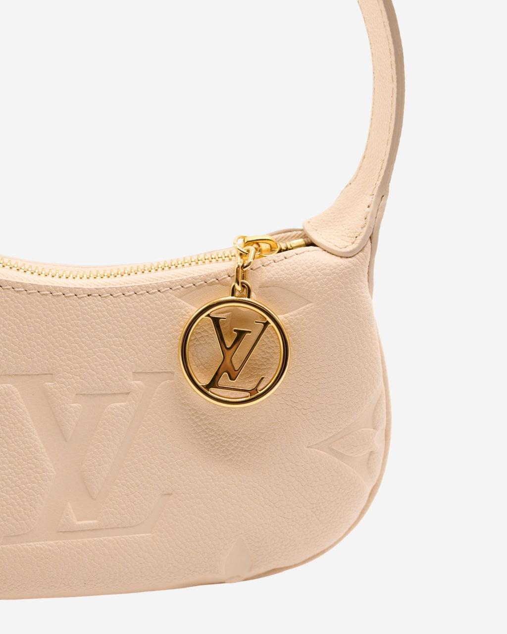 - Description: Louis Vuitton handbag in beige Empreinte leather, adjustable top handle, double-zip main opening, beige suede lining, signature 'LV' logo charm, gold-tone hardware
