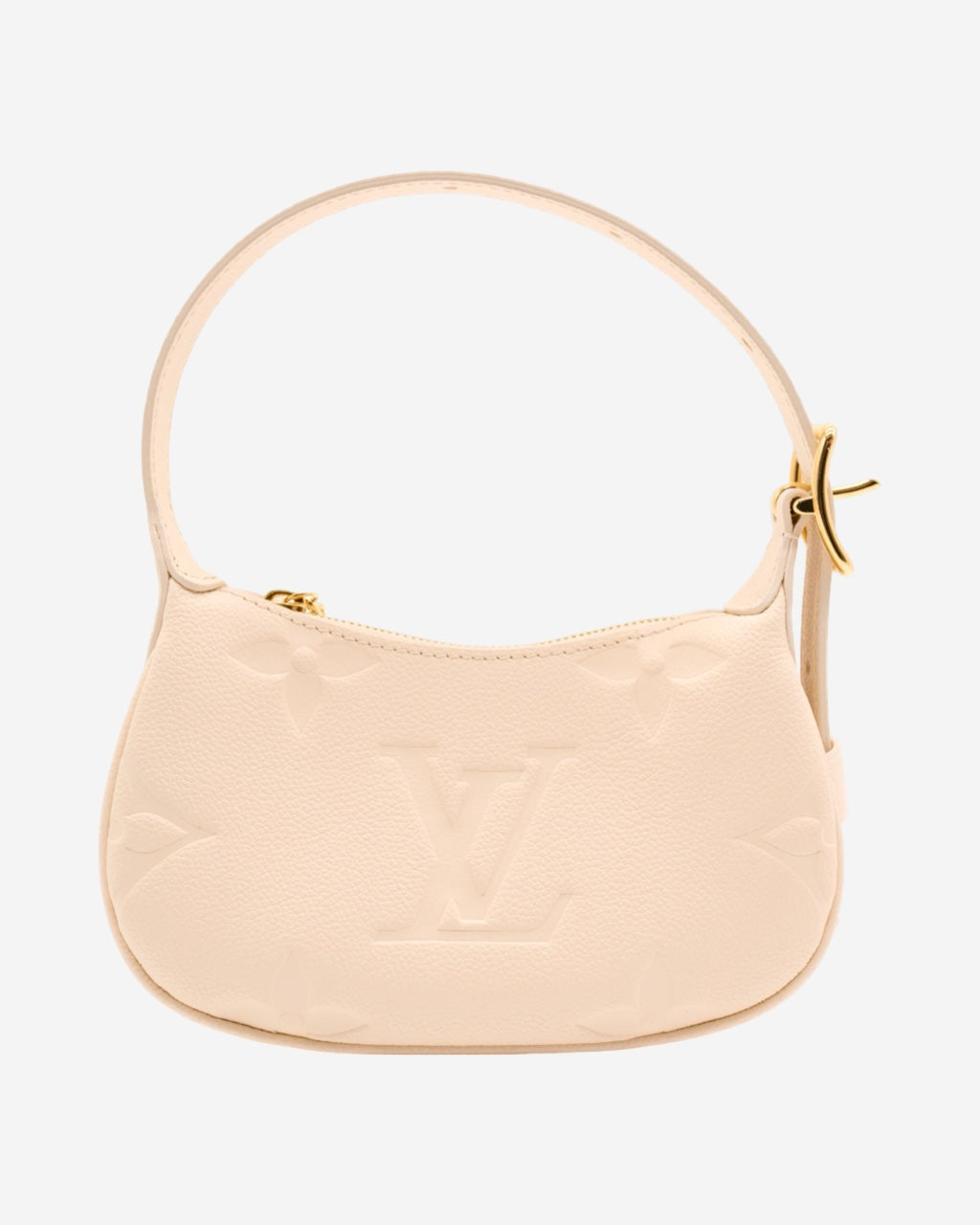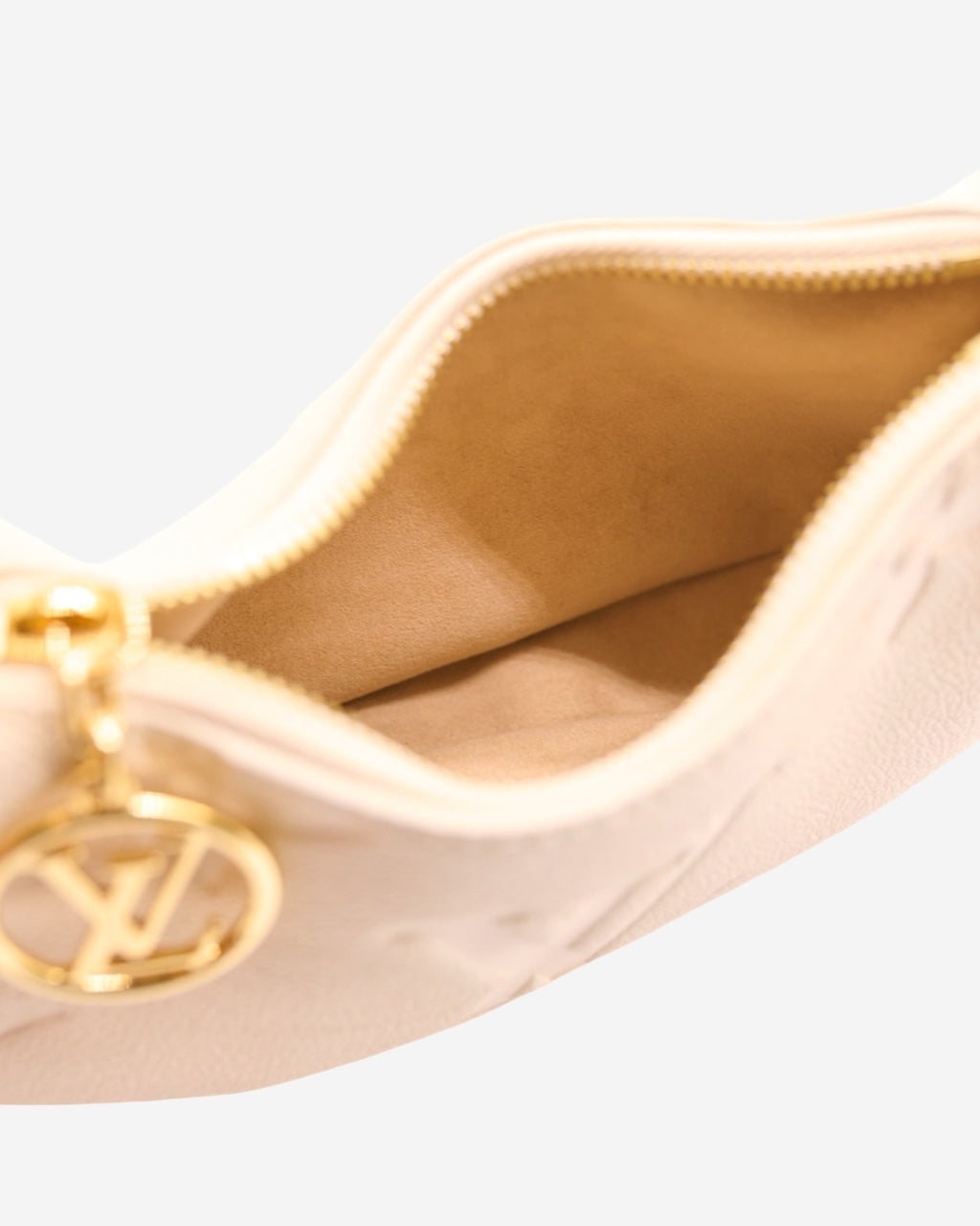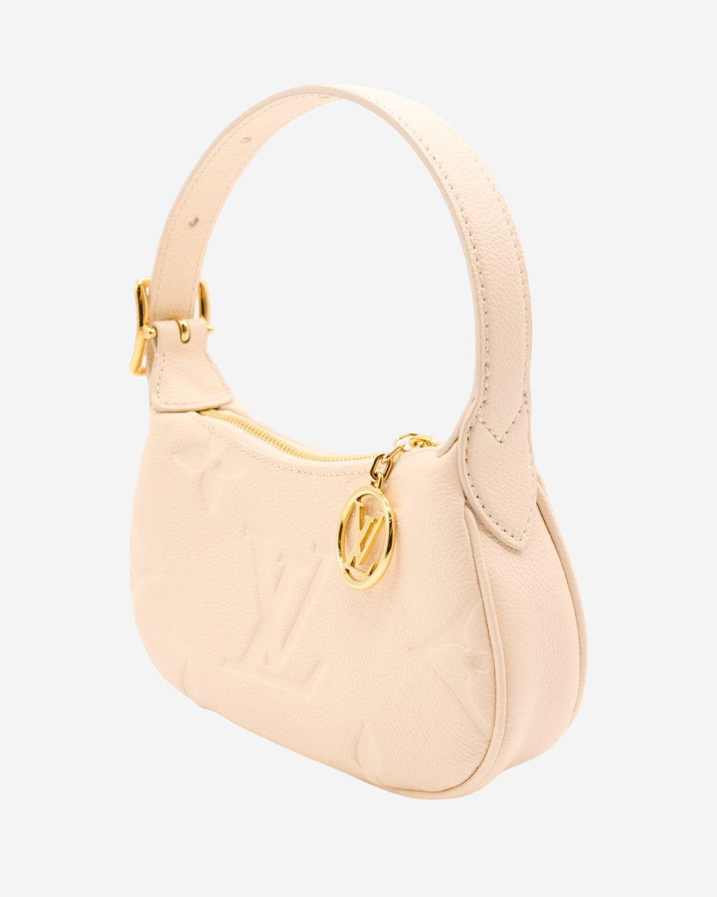 - Description: Louis Vuitton handbag in beige Empreinte leather, adjustable top handle, double-zip main opening, beige suede lining, signature 'LV' logo charm, gold-tone hardware