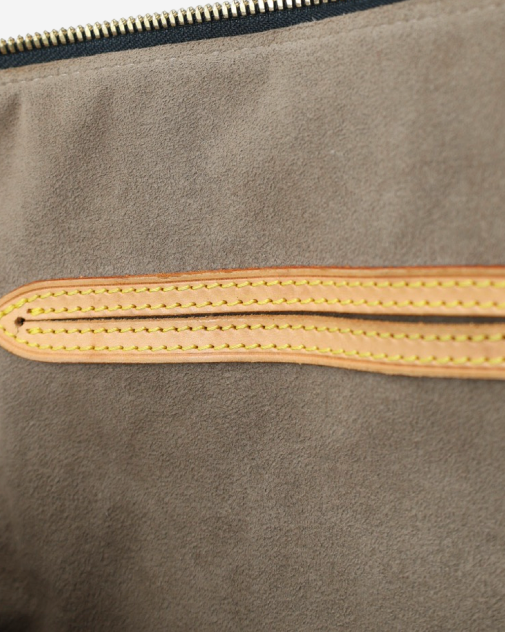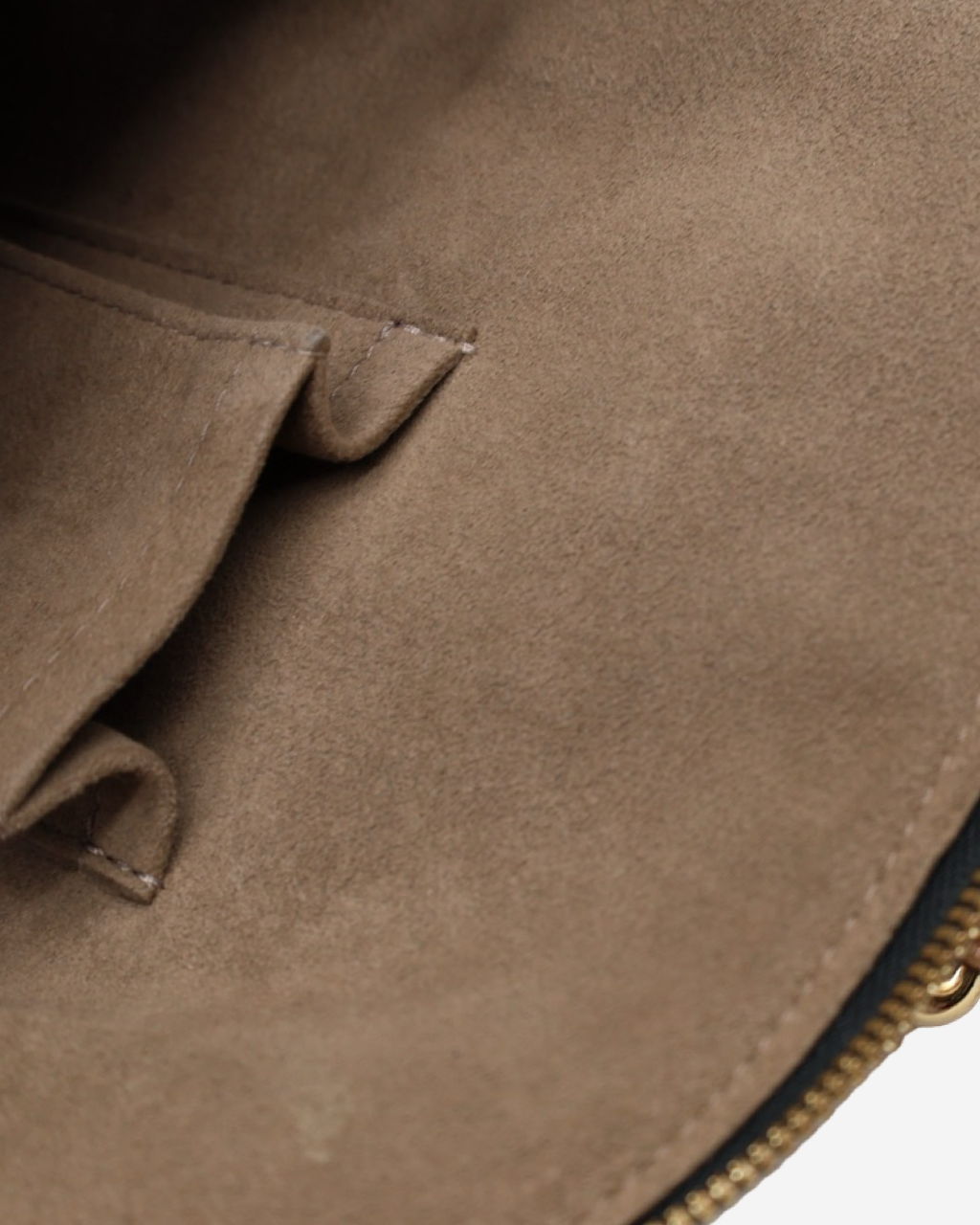 - Description: Handbag with double handles, main opening with zipper, red suede interior, gold-colored hardware
