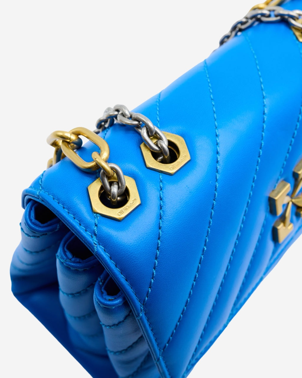 - Description: Off White crossbody bag in blue leather, metal front plate, main opening with flap and magnetic clasp, double chain top handle in silver and gold, three main compartments with black textile lining and two-way zip pocket, gold-tone hardware