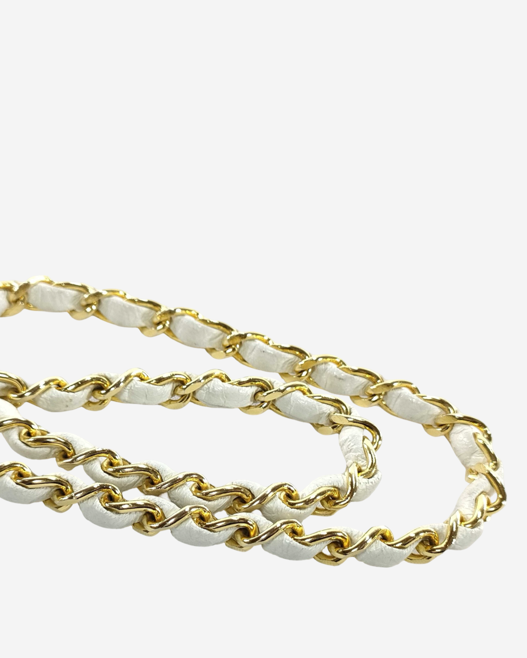 - Description: White leather crossbody bag, front clasp, long fixed handle, flap opening, synthetic interior lining, gold-tone hardware