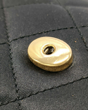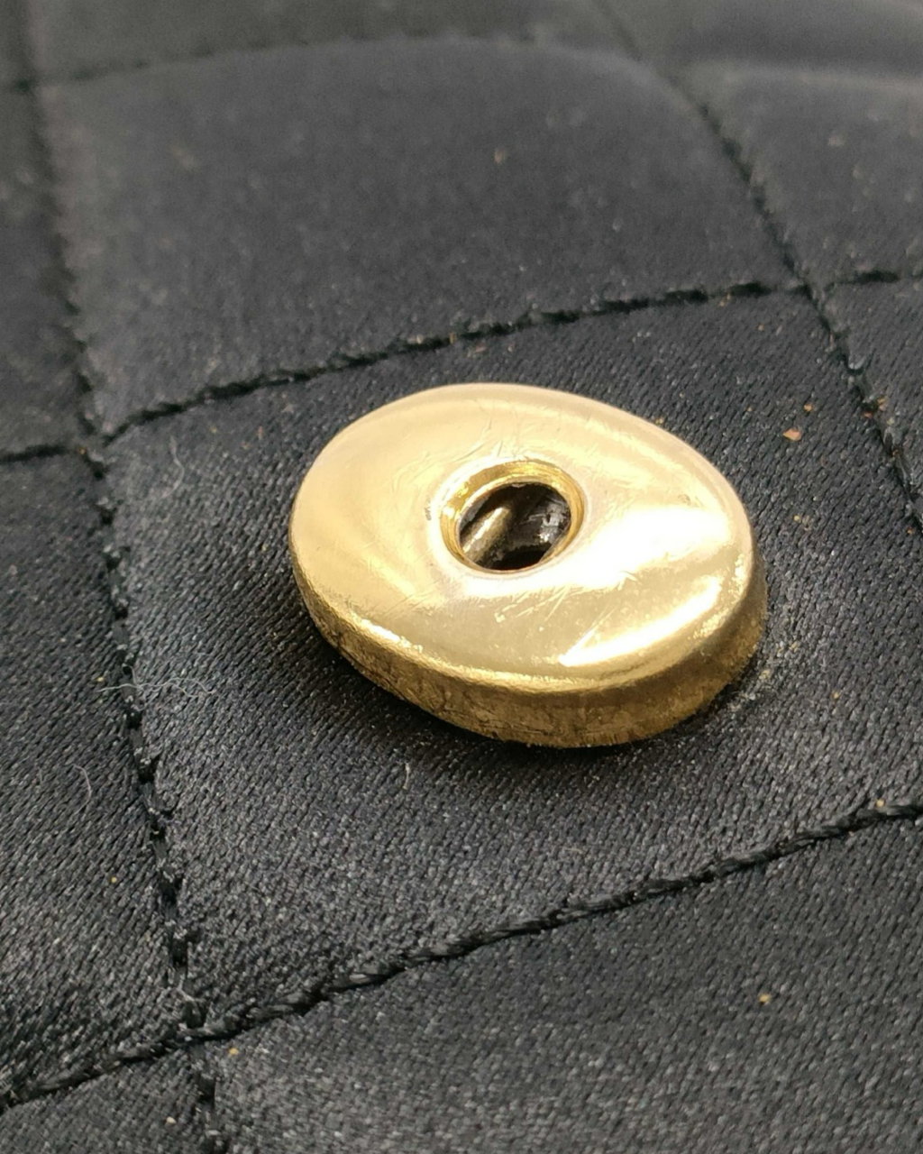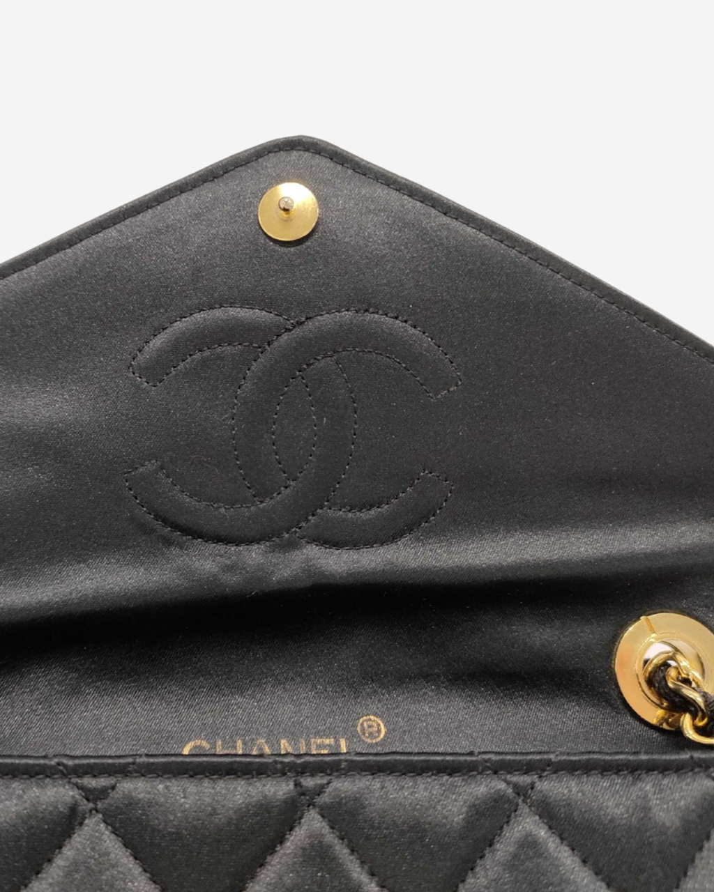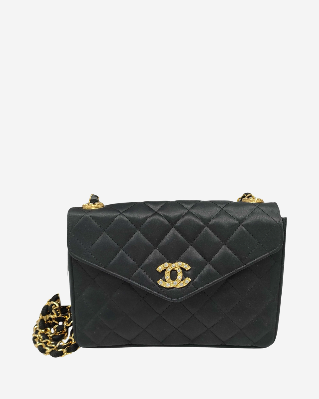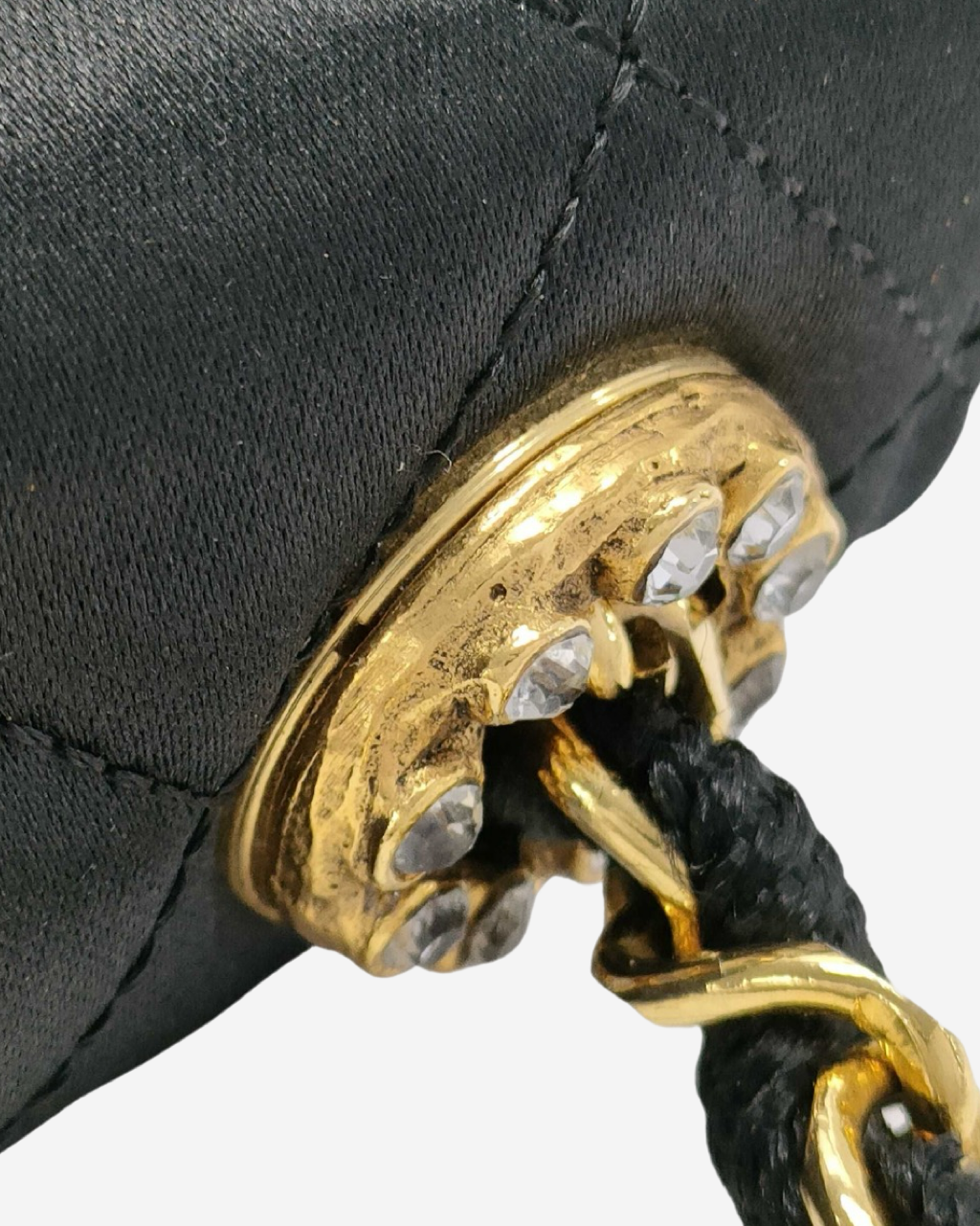 - Description: Black silk shoulder bag, 24k gold-plated CC clasp with rhinestones, gold-tone hardware