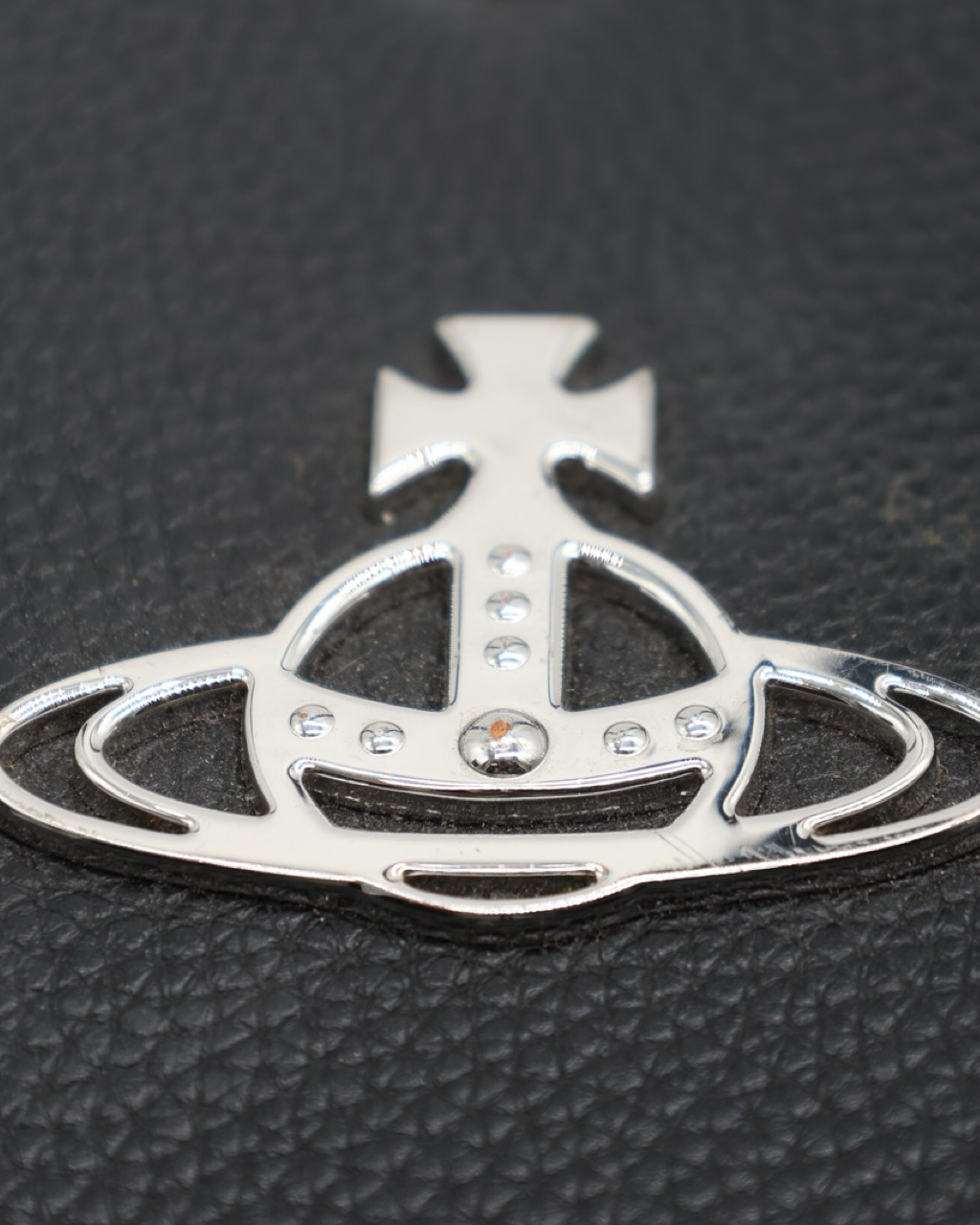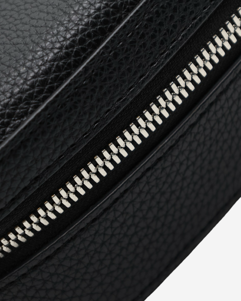 - Description: Black leather crossbody bag, signature orb front, zip around closure, long handle, silver-tone hardware