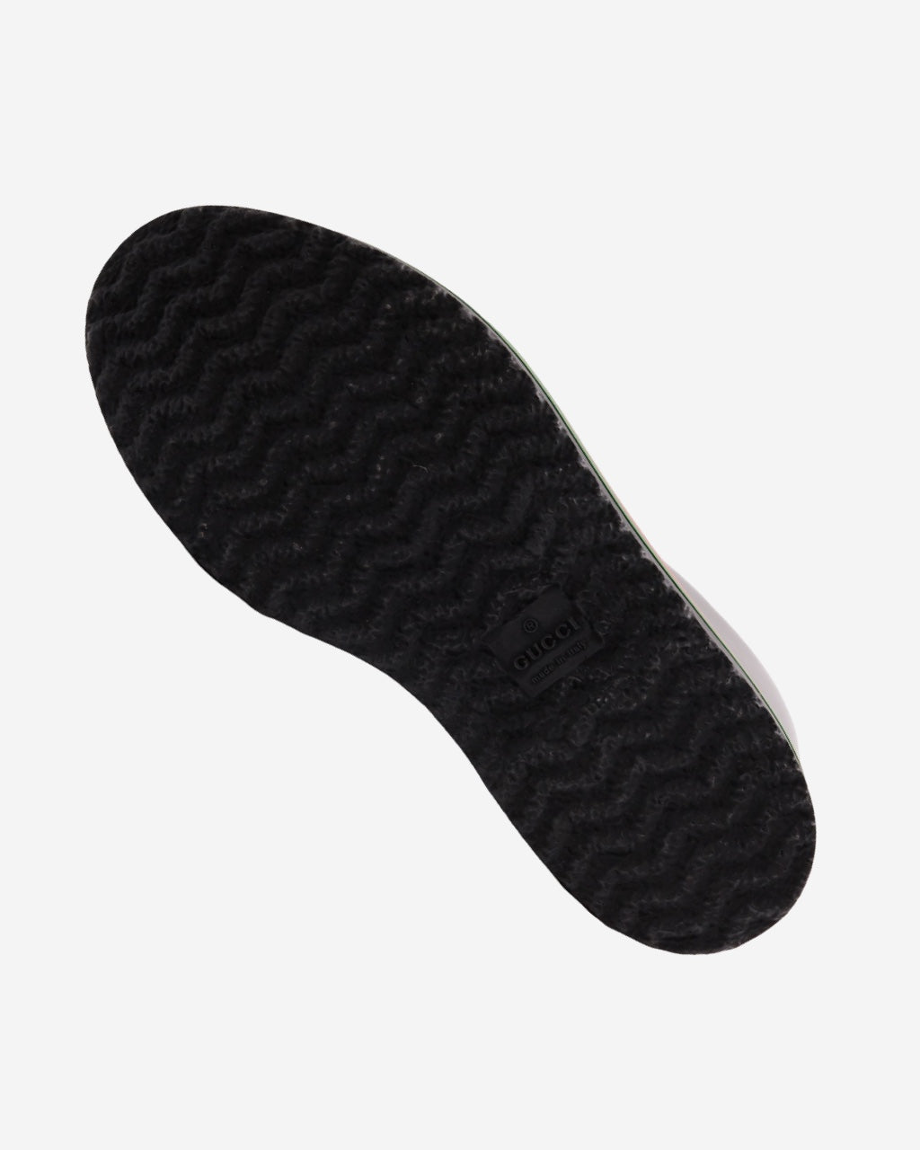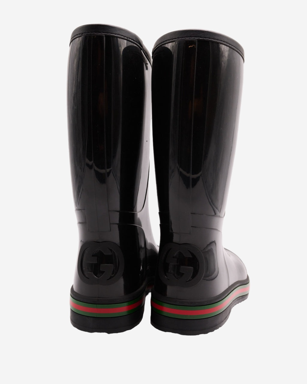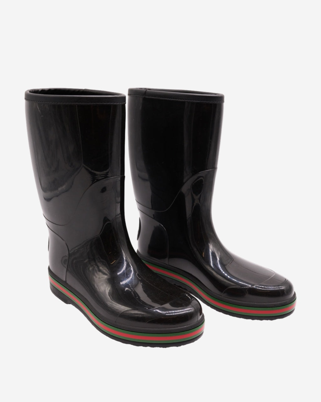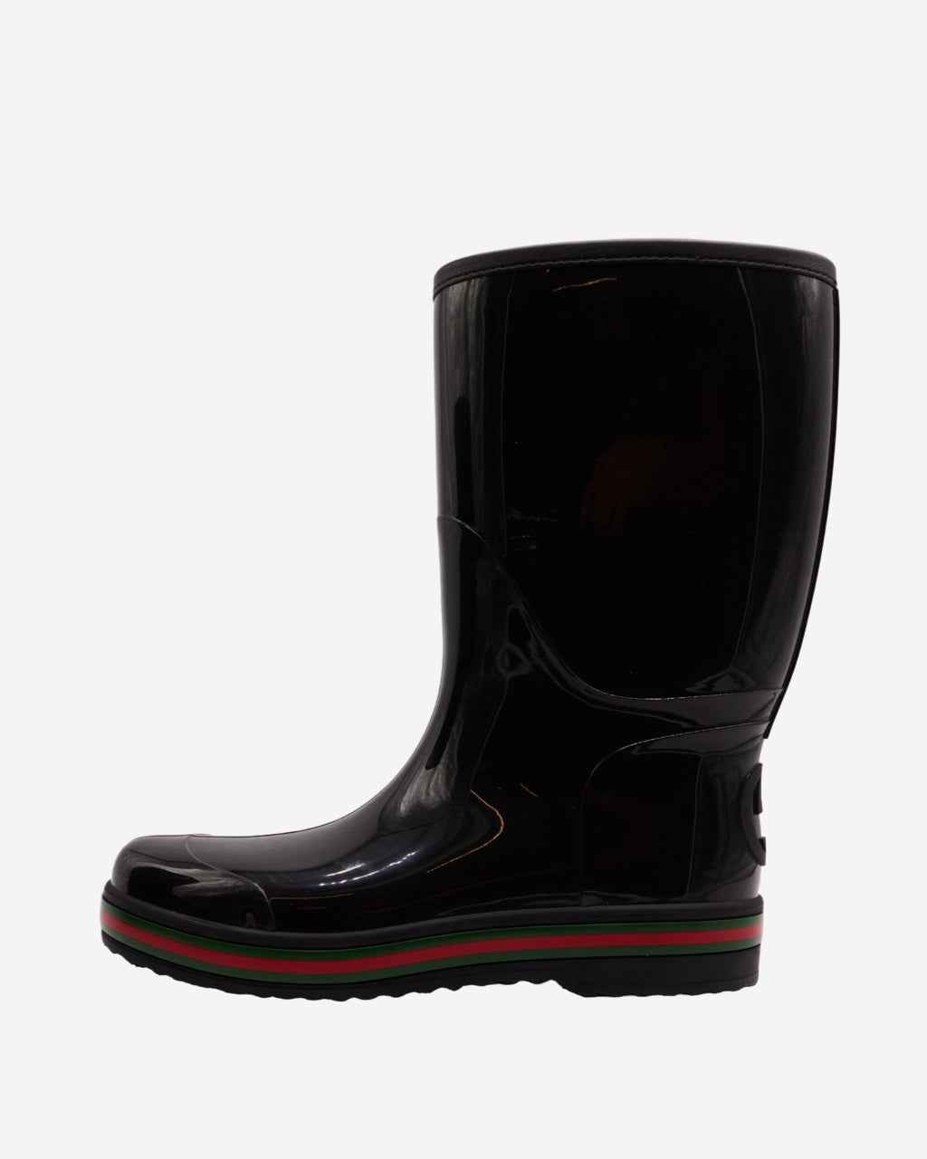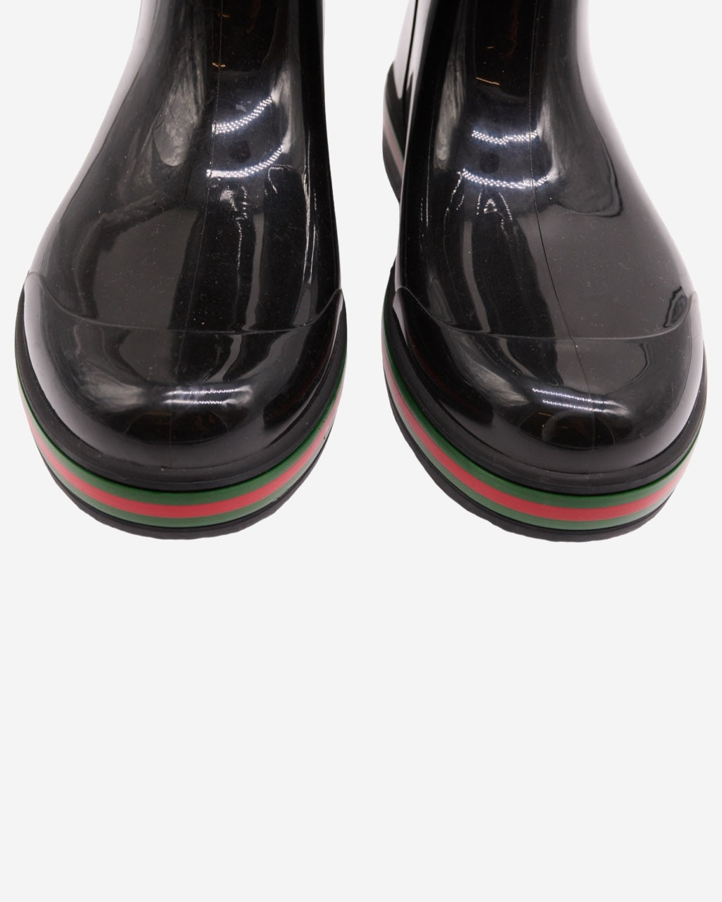 - Description: Gucci rain boots in black rubber, rounded toe, leather trim, textile lining, rubber sole with signature two-tone trim, GG on the back
