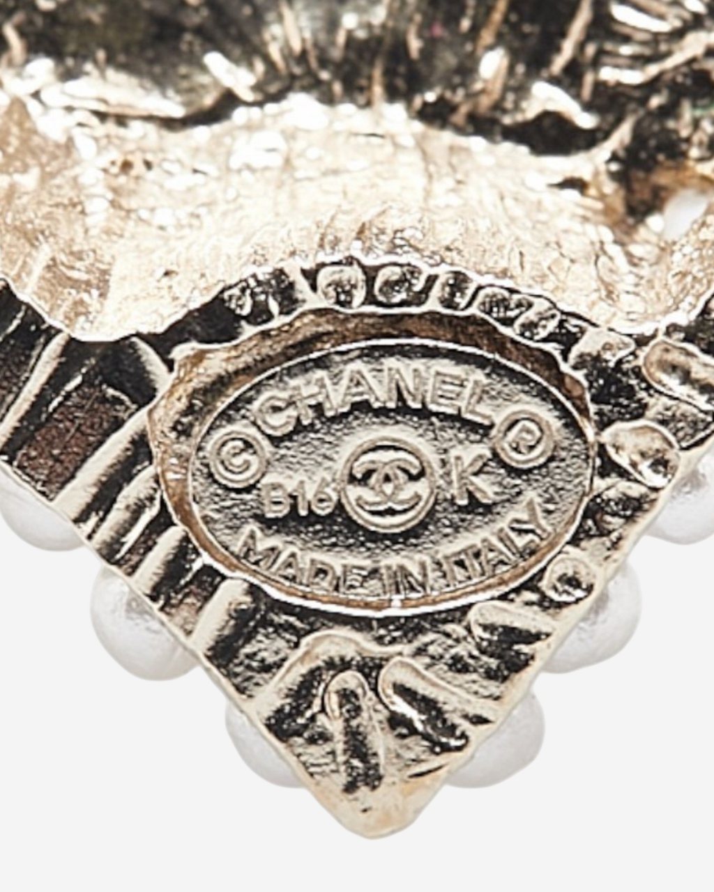 - Description: Chanel brooch in the shape of a heart, 'CC' logo on the front, rhinestone embellishments and pink motifs, adjustable back
