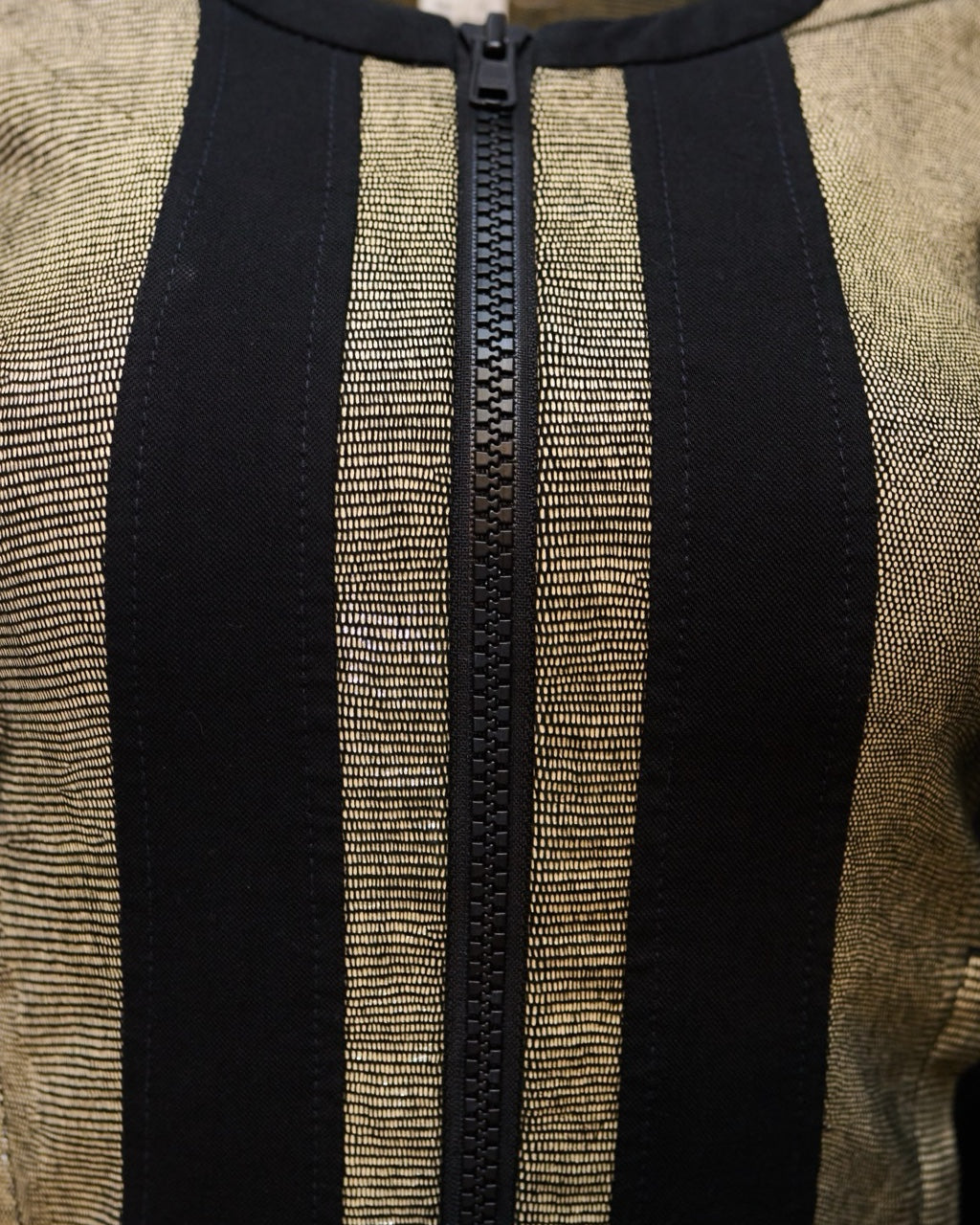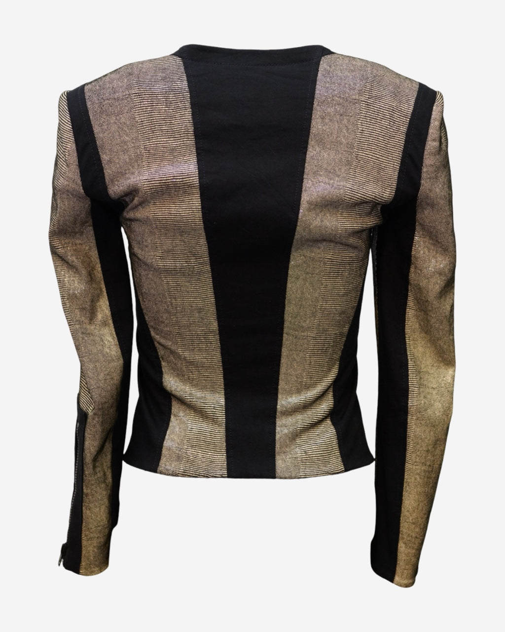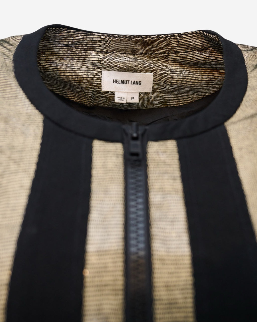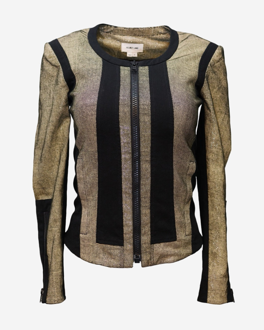 - Description: Helmut Lang jacket in black, round neck, long sleeves, leather panels with shiny texture, adjustable with double-way zipper at the front and cuffs, side pockets