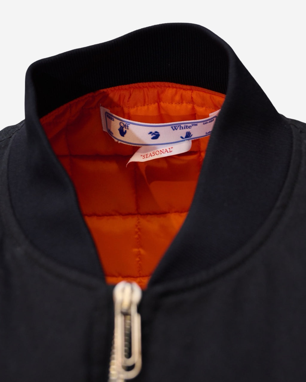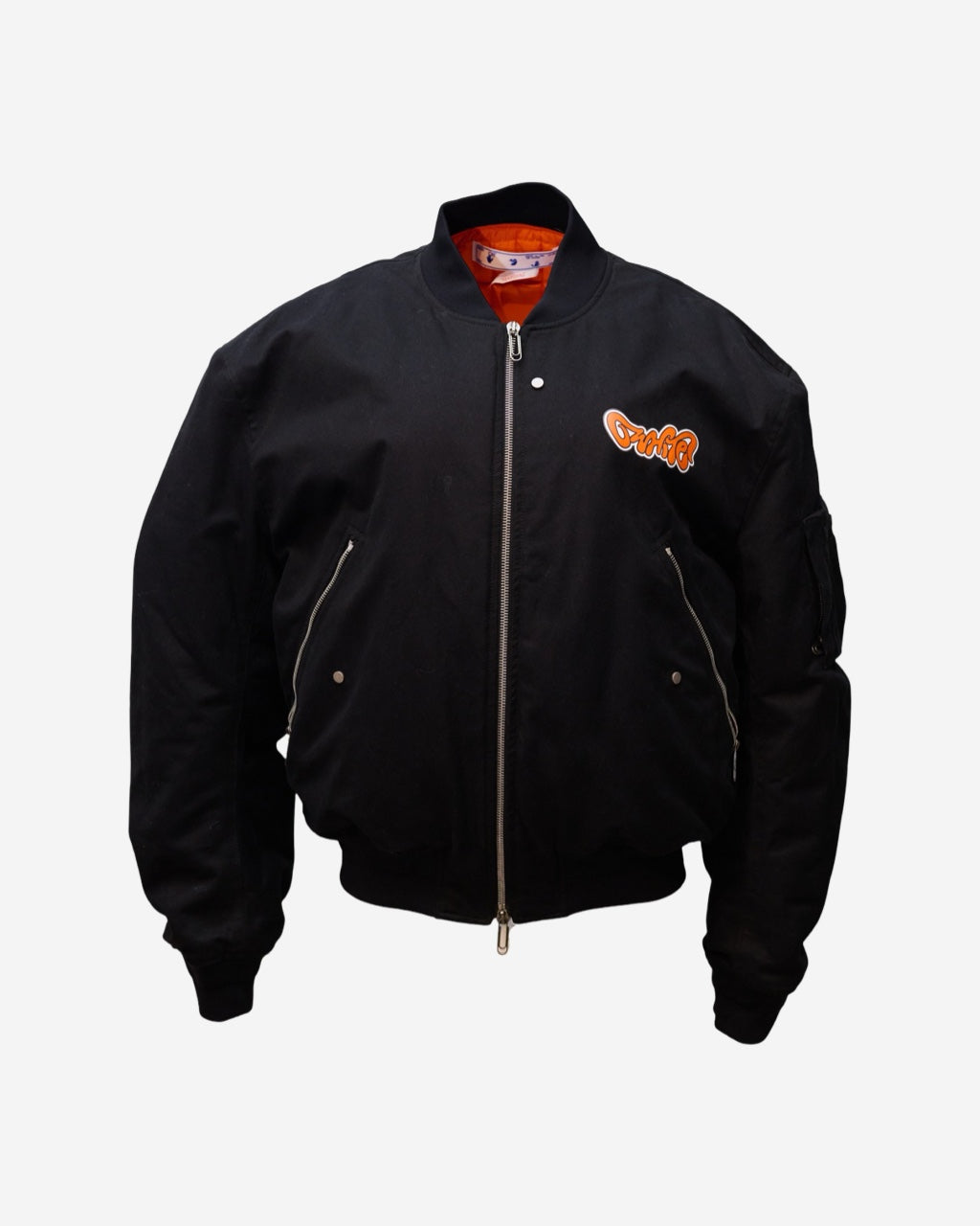 - Description: Jacket Off White black cotton bomber jacket, round neck, long sleeves, two-way central zip fastening, orange lining, front and back print, side zip pockets, silver-tone hardware