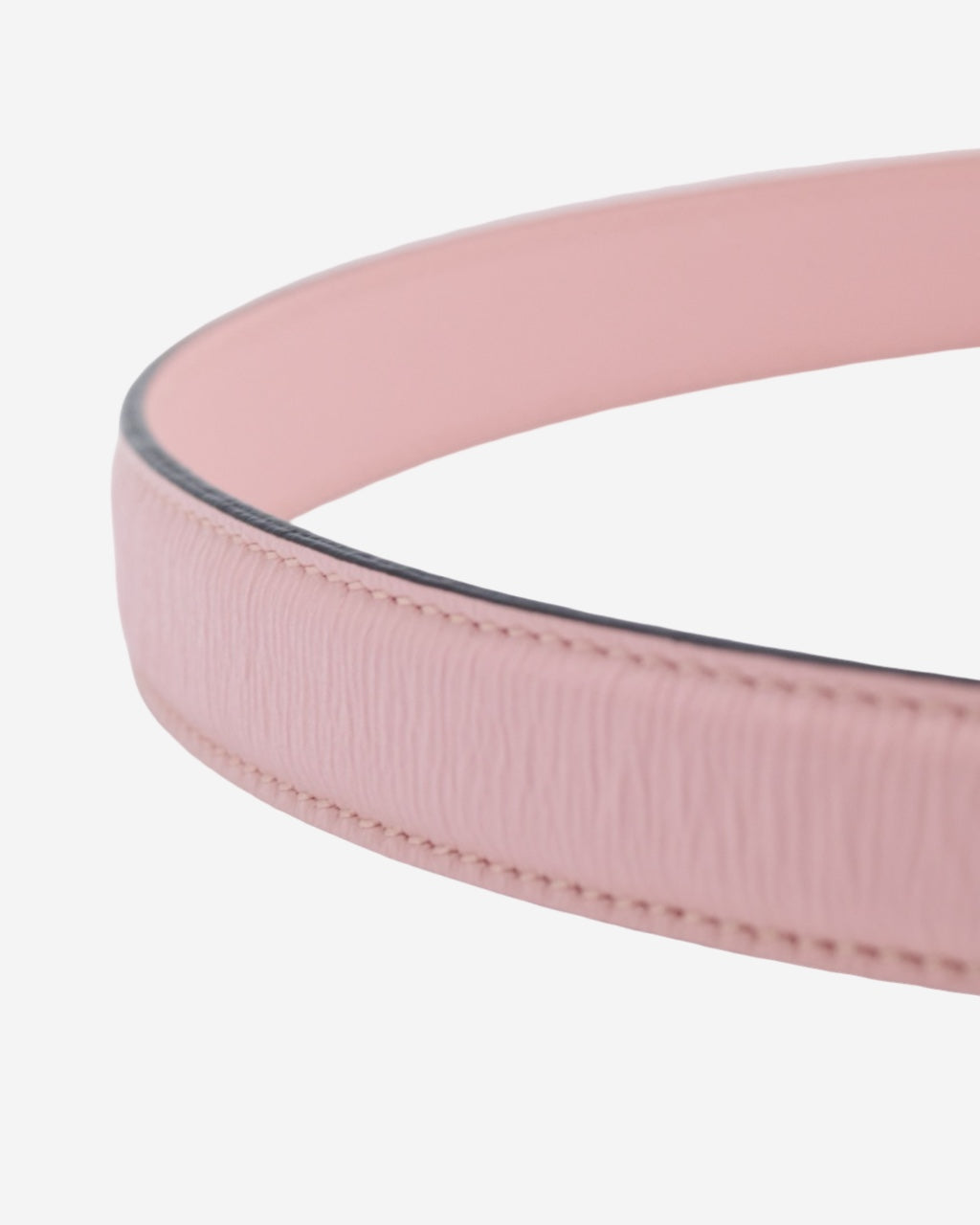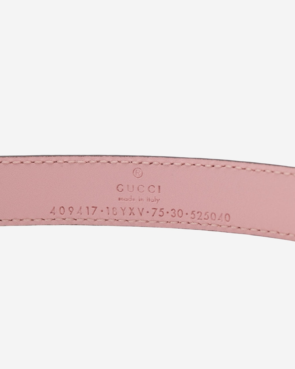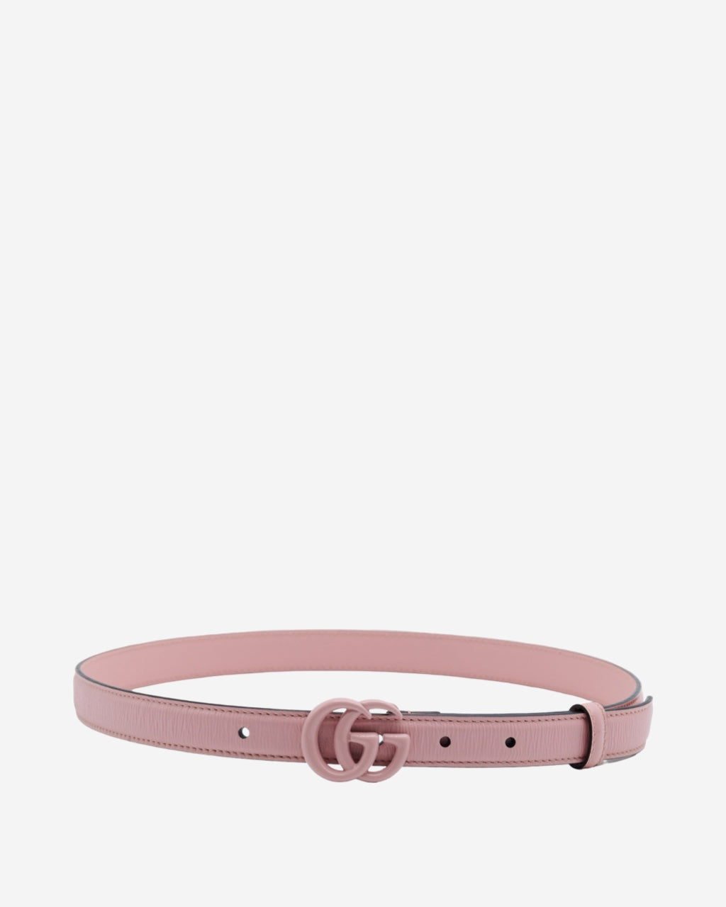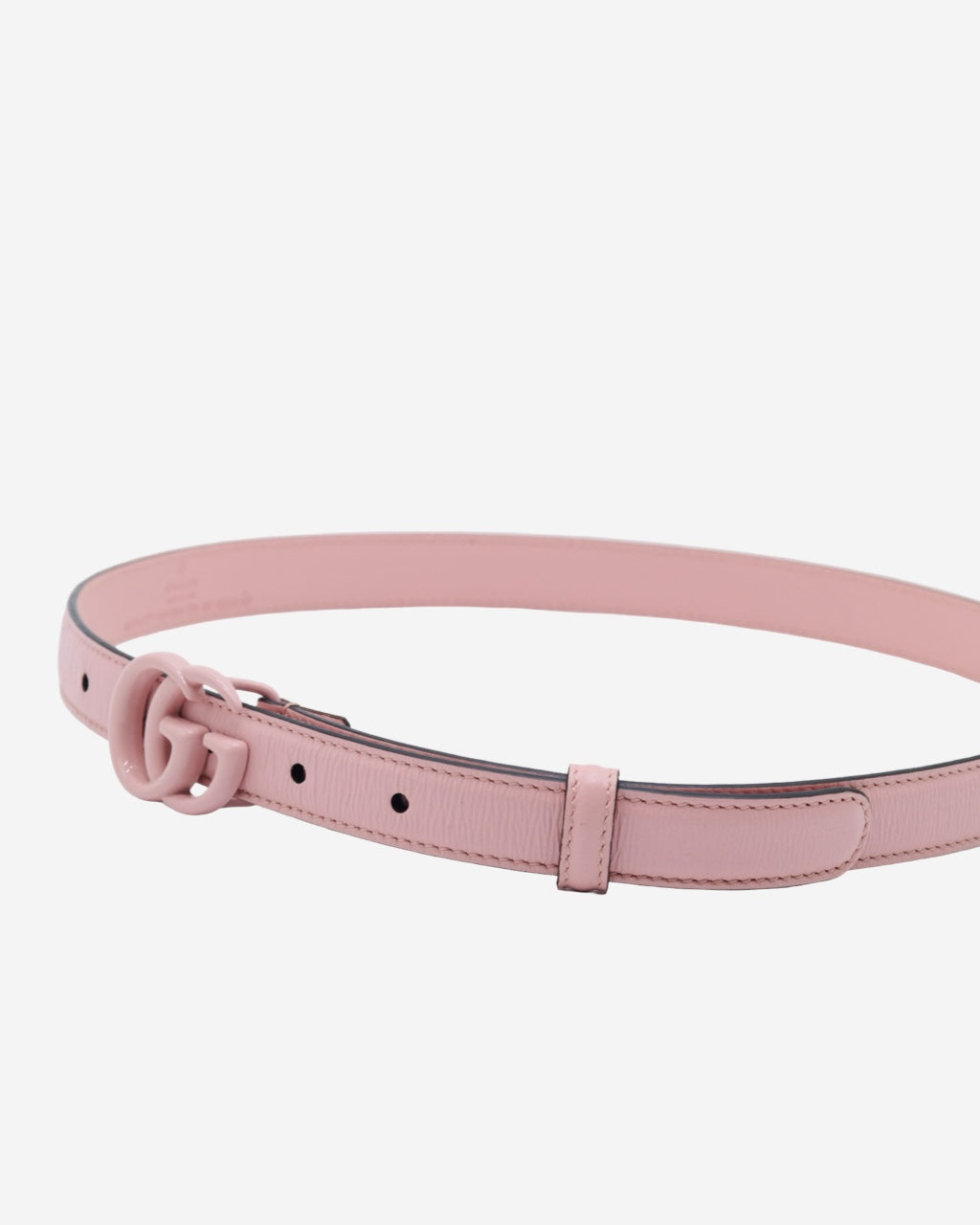 - Description: Gucci belt in pink leather, metal 'GG' buckle on the front, logo embossed on the inside, pink-tone hardware