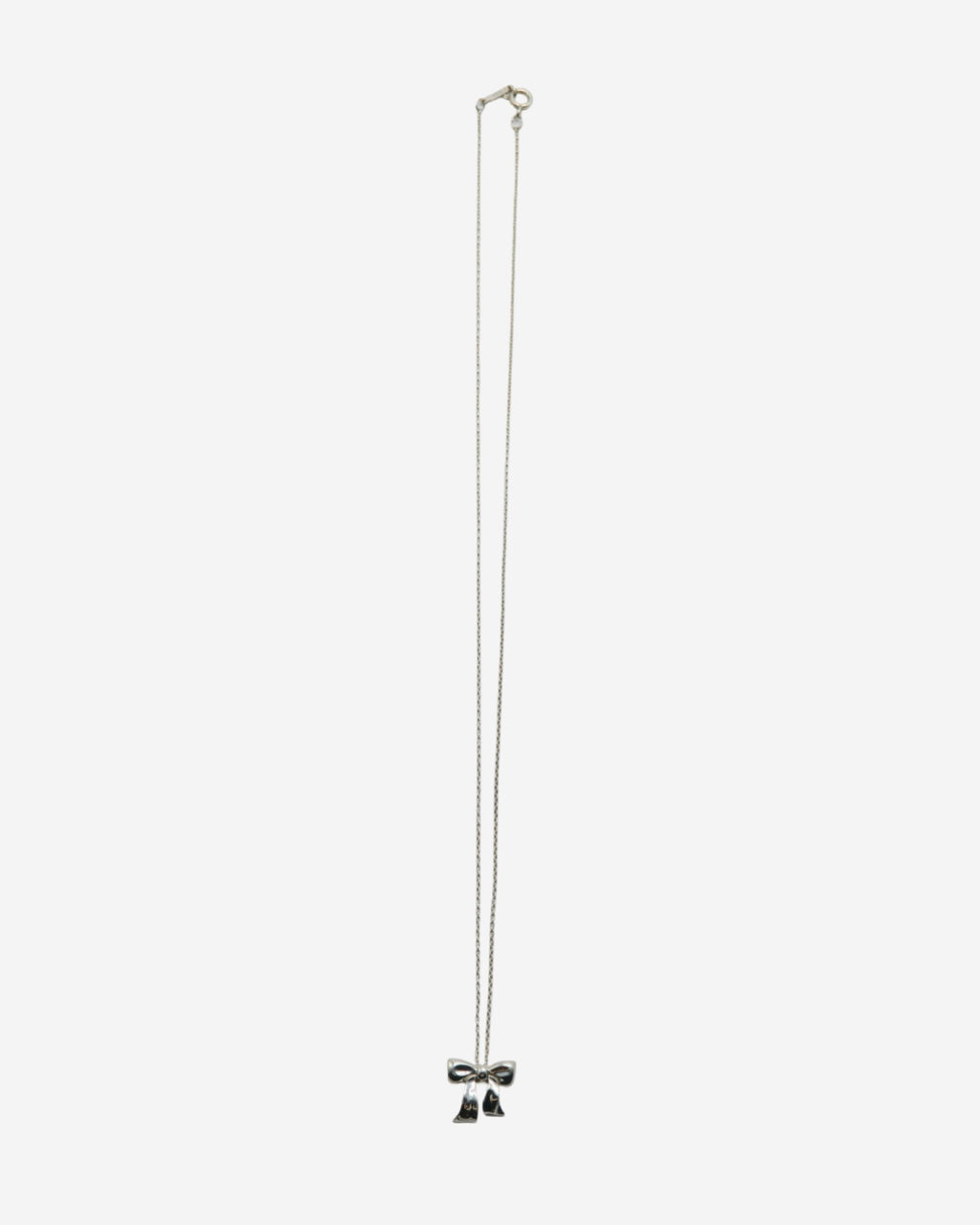 - Description: Tiffany & Co. necklace in silver, bow pendant with engraving on the back, thin chain, lobster clasp